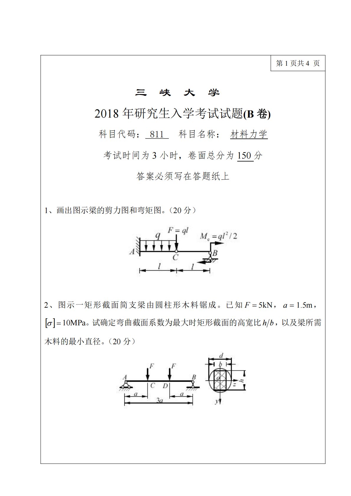 第1页共4页三峡大学2018年研究生入学考试试题(B卷)科目代码:811科目名称:材料力学考试时间为3小时,卷面总分为150分答案必须写在答题纸上1、画出图示梁的剪力图和弯矩图。(20分)2、图示一矩形截面简支梁由圆柱形木料锯成。已知F5kN,a1.5m,10MPa。试确定弯曲截面系数为最大时矩形截面的高宽比hb,以及梁所需木料的最小直径。(20分)第2页3、试求图示弯曲刚度为EI的等直梁的挠曲线方程和转角方程,并确定其最大挠度wmax和最大转角qmax。(15分)4、如图所示的单元体,弹性模量E200GPa,泊松比0.3,试求:(1)三个主应力;(2)最大切应力;(3)图示...