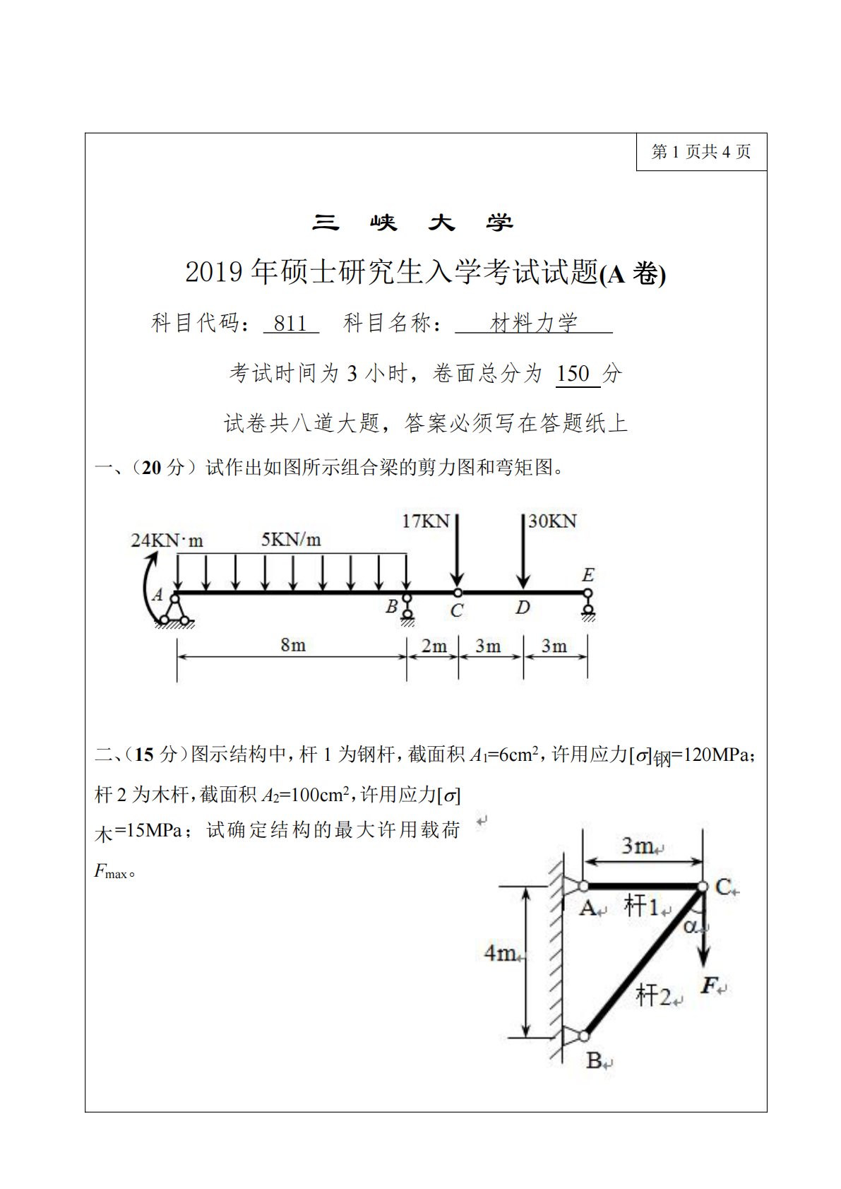 第1页共4页三峡大学2019年硕士研究生入学考试试题(A卷)科目代码:811科目名称:材料力学考试时间为3小时,卷面总分为150分试卷共八道大题,答案必须写在答题纸上一、(20分)试作出如图所示组合梁的剪力图和弯矩图。二、(15分)图示结构中,杆1为钢杆,截面积A1=6cm2,许用应力[]钢=120MPa;杆2为木杆,截面积A2=100cm2,许用应力[]木=15MPa;试确定结构的最大许用载荷Fmax。第2页三、(15分)某一钻探机的功率为10KW,转速为n=180r/min。钻杆钻入土层的深度为l=40m。如土壤对钻杆的阻力可看作是均匀分布的力偶,试求分布力偶的集度m,并作钻杆的扭矩图...