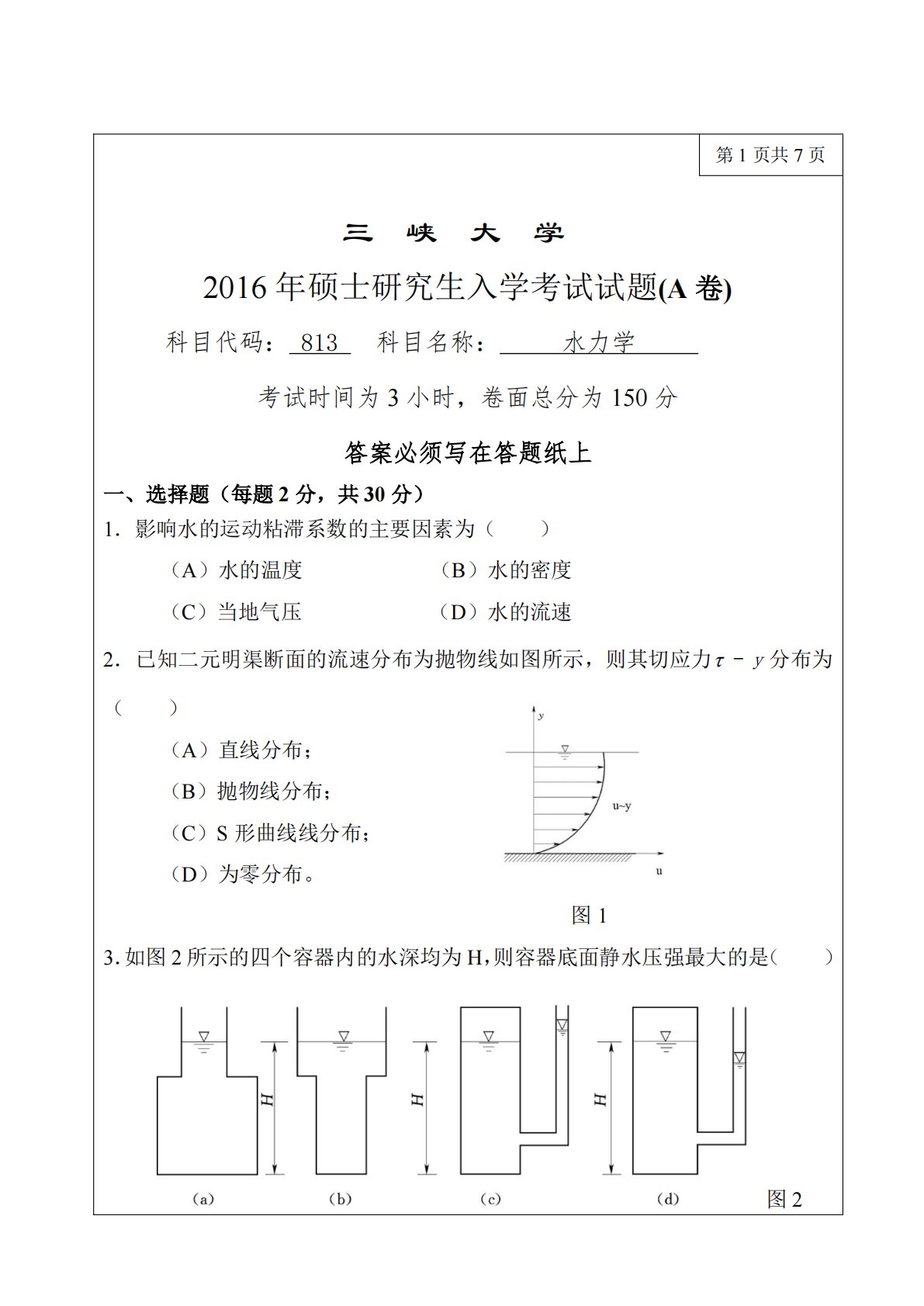 第1页共7页三峡大学2016年硕士研究生入学考试试题(A卷)科目代码:813科目名称:水力学考试时间为3小时,卷面总分为150分答案必须写在答题纸上一、选择题(每题2分,共30分)1.影响水的运动粘滞系数的主要因素为()(A)水的温度(C)当地气压(B)水的密度(D)水的流速2.已知二元明渠断面的流速分布为抛物线如图所示,则其切应力-y分布为()(A)直线分布;(B)抛物线分布;(C)S形曲线线分布;(D)为零分布。图13.如图2所示的四个容器内的水深均为H,则容器底面静水压强最大的是()图2第2页4.雷诺数的物理意义是()(A)重力与惯性力之比(C)粘滞力与惯性力之比(B)重力与粘滞力之比...