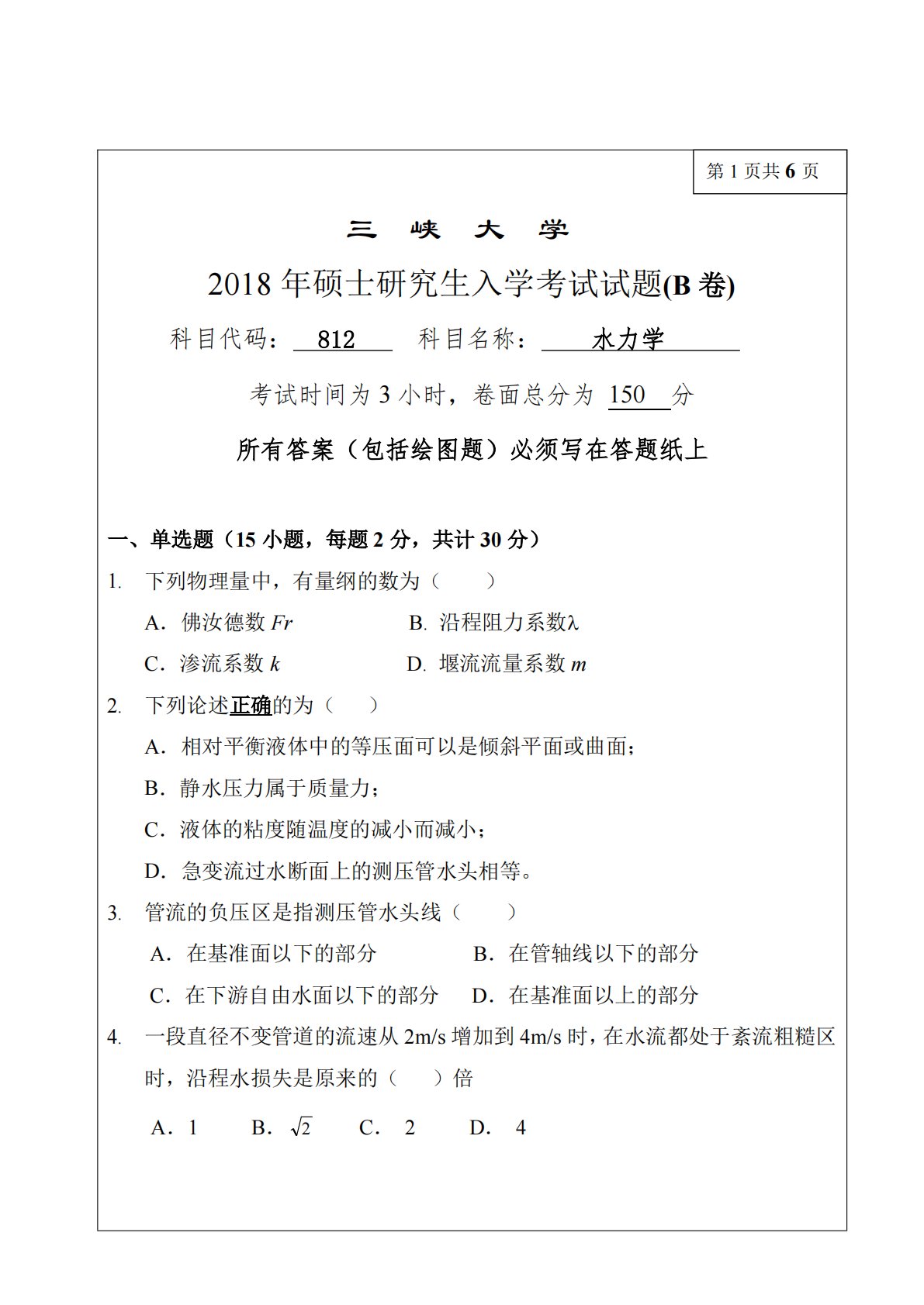 三峡大学812水力学2018年真题