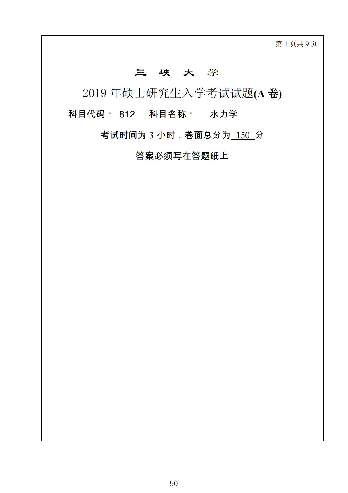 第1页共9页三峡大学2019年硕士研究生入学考试试题(A卷)科目代码:812科目名称:水力学考试时间为3小时,卷面总分为150分答案必须写在答题纸上90第2页一、是非题(正确的划“√”,错误的划“×)(每题1分,共20分)1、理想液体就是不可压缩液体。()2、图中矩形平板上静水总压力的作用点位于受压面形心点O以下h/6处。()3、圆管中层流的雷诺数必然大于2320。()4、棱柱体明渠的临界水深只与通过的流量、明渠断面形状及尺寸有关,而与渠道的纵坡无关。()5、水流总是从压强大的地方向压强小的地方流动。()6、在长管中,总水头线与测压管水头线重合。()7、缓坡上可以出现非均匀急流。()8、渐变流...