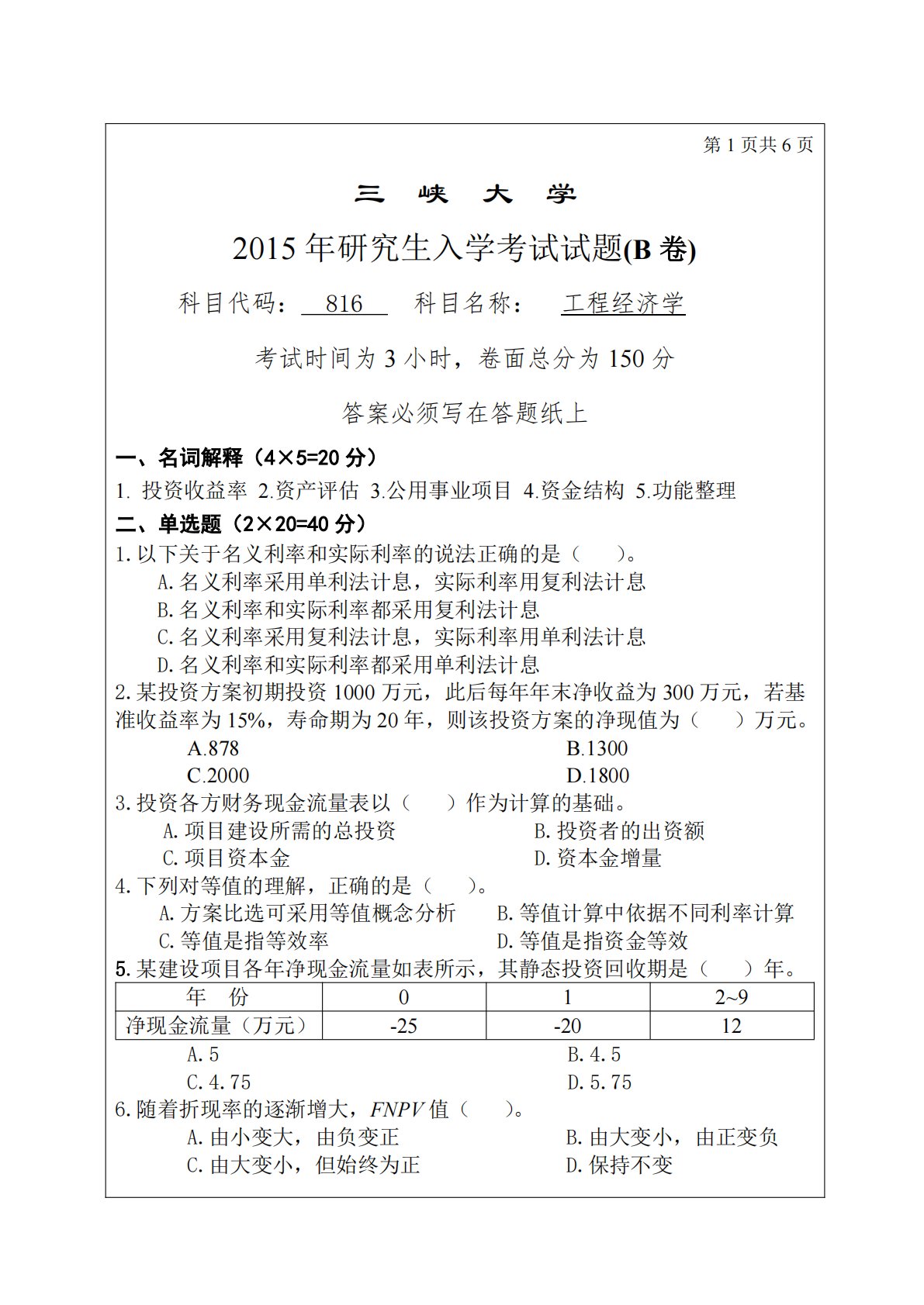 第1页共6页三峡大学2015年研究生入学考试试题(B卷)科目代码:816科目名称:工程经济学考试时间为3小时,卷面总分为150分答案必须写在答题纸上一、名词解释(4×5=20分)1.投资收益率2.资产评估3.公用事业项目4.资金结构5.功能整理二、单选题(2×20=40分)1.以下关于名义利率和实际利率的说法正确的是()。A.名义利率采用单利法计息,实际利率用复利法计息B.名义利率和实际利率都采用复利法计息C.名义利率采用复利法计息,实际利率用单利法计息D.名义利率和实际利率都采用单利法计息2.某投资方案初期投资1000万元,此后每年年末净收益为300万元,若基准收益率为15%,寿命期为20年...