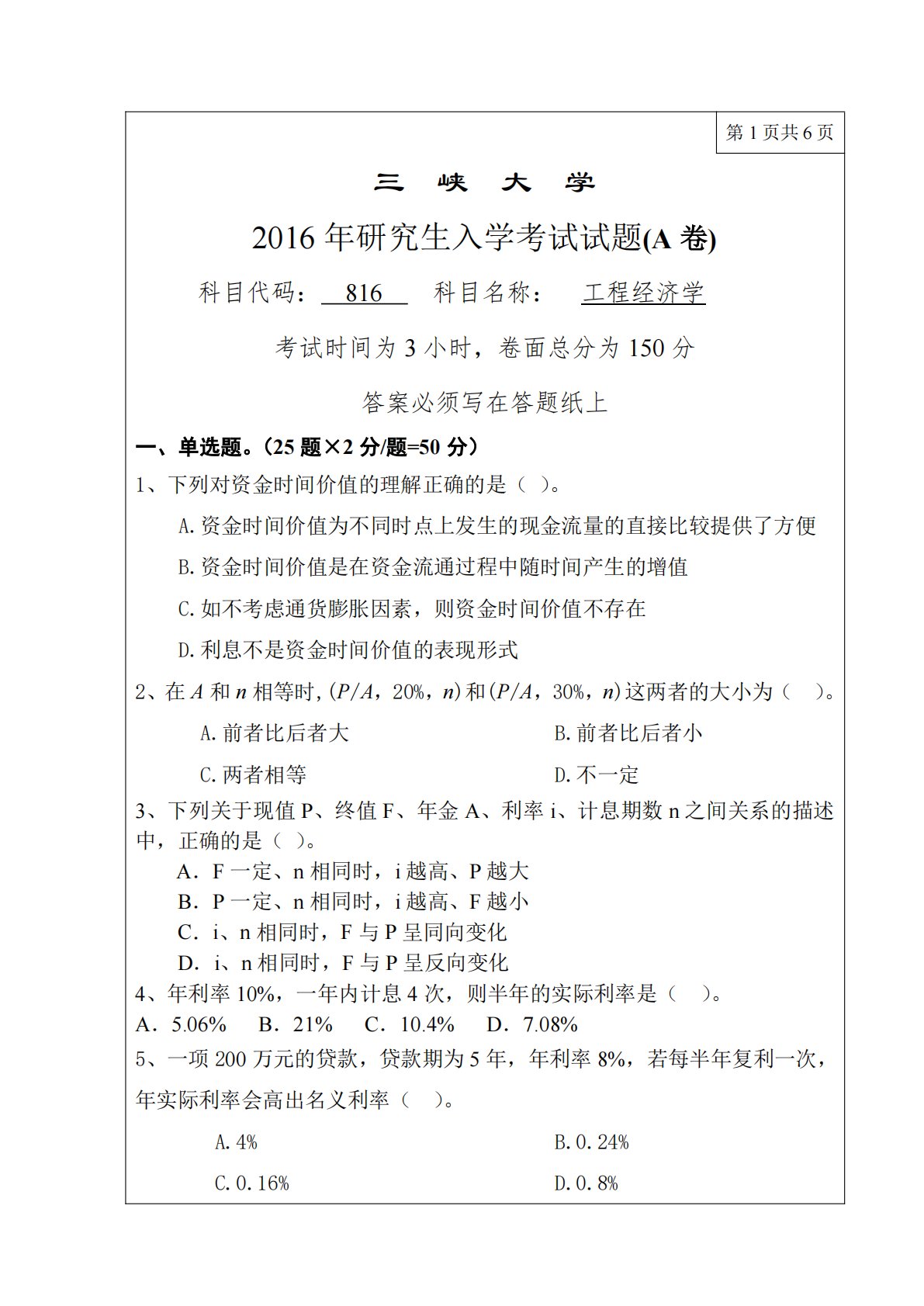 第1页共6页三峡大学2016年研究生入学考试试题(A卷)科目代码:816科目名称:工程经济学考试时间为3小时,卷面总分为150分答案必须写在答题纸上一、单选题。(25题×2分/题=50分)1、下列对资金时间价值的理解正确的是()。A.资金时间价值为不同时点上发生的现金流量的直接比较提供了方便B.资金时间价值是在资金流通过程中随时间产生的增值C.如不考虑通货膨胀因素,则资金时间价值不存在D.利息不是资金时间价值的表现形式2、在A和n相等时,(P/A,20%,n)和(P/A,30%,n)这两者的大小为()。A.前者比后者大C.两者相等B.前者比后者小D.不一定3、下列关于现值P、终值F、年金A、利...