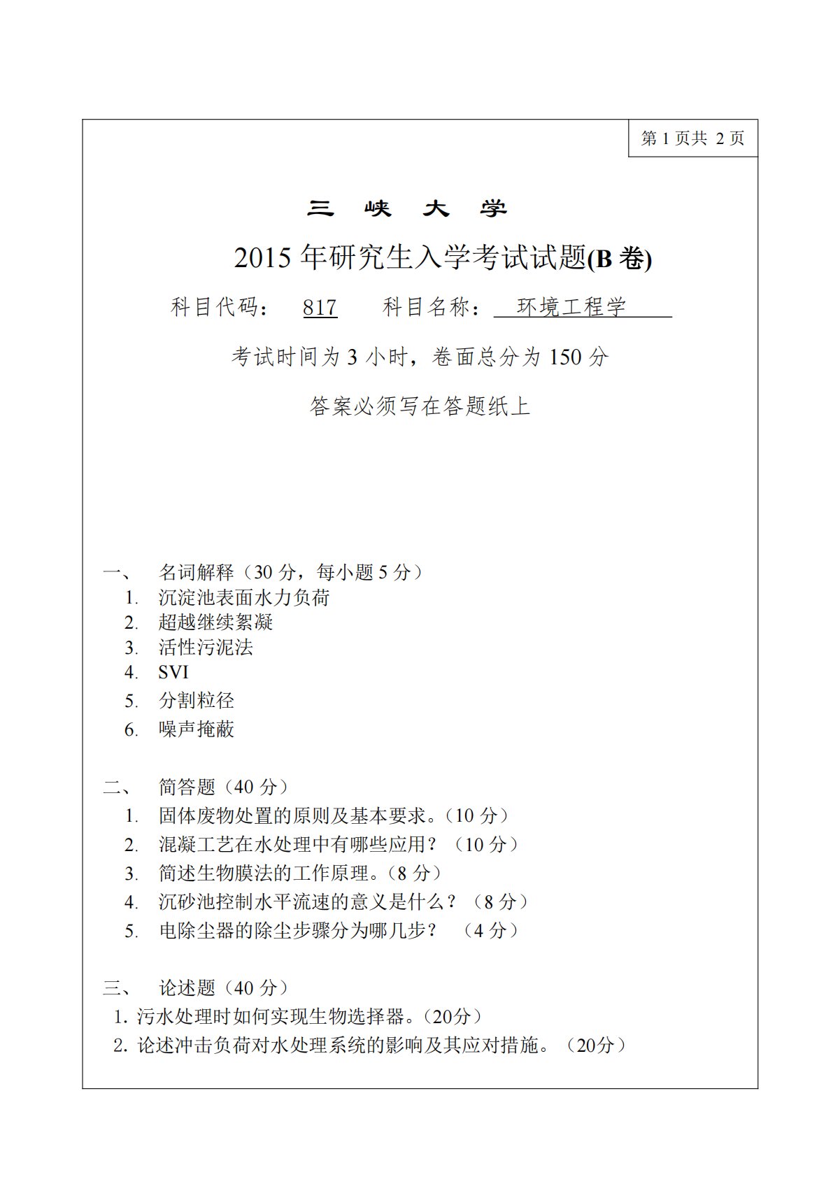 第1页共2页三峡大学2015年研究生入学考试试题(B卷)科目代码:817科目名称:环境工程学考试时间为3小时,卷面总分为150分答案必须写在答题纸上一、名词解释(30分,每小题5分)1.沉淀池表面水力负荷2.超越继续絮凝3.活性污泥法4.SVI5.分割粒径6.噪声掩蔽二、简答题(40分)1.固体废物处置的原则及基本要求。(10分)2.混凝工艺在水处理中有哪些应用?(10分)3.简述生物膜法的工作原理。(8分)4.沉砂池控制水平流速的意义是什么?(8分)5.电除尘器的除尘步骤分为哪几步?(4分)三、论述题(40分)1.污水处理时如何实现生物选择器。(20分)2.论述冲击负荷对水处理系统的影响及其...