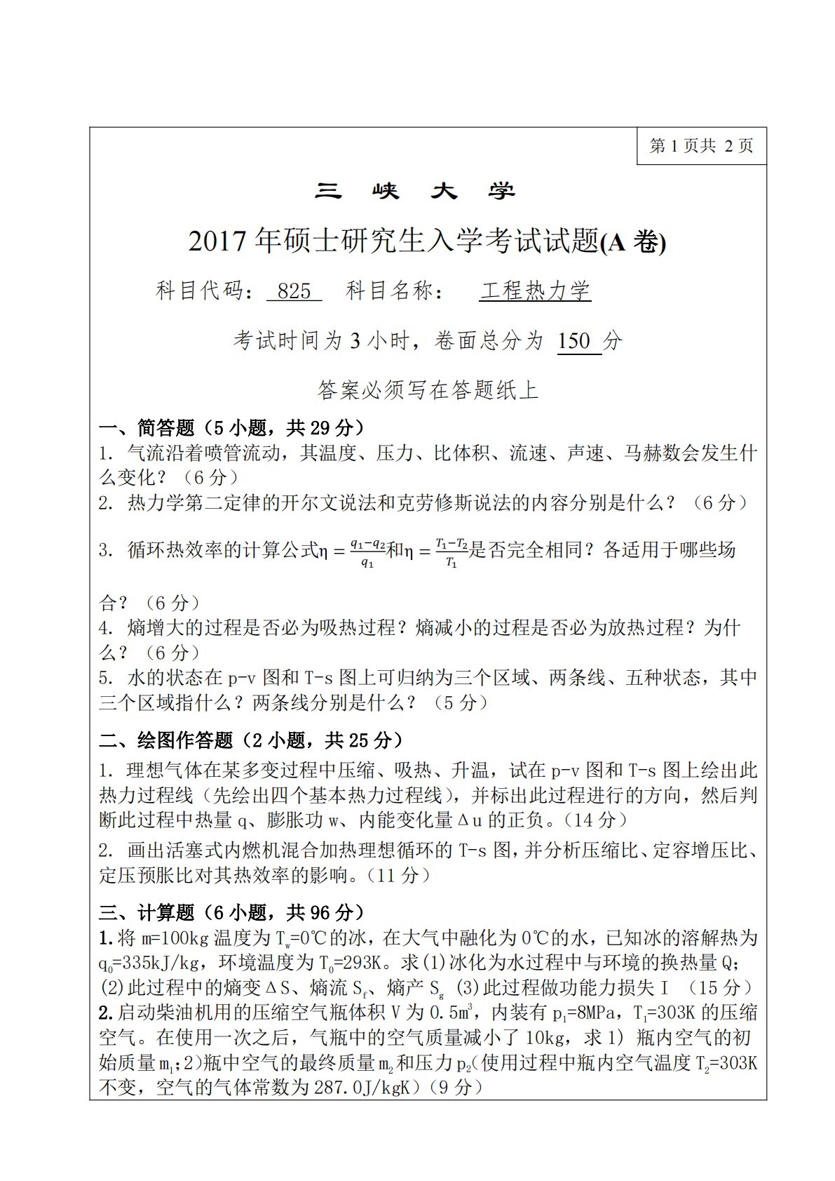 第1页共2页三峡大学2017年硕士研究生入学考试试题(A卷)科目代码:825科目名称:工程热力学考试时间为3小时,卷面总分为150分答案必须写在答题纸上一、简答题(5小题,共29分)1.气流沿着喷管流动,其温度、压力、比体积、流速、声速、马赫数会发生什么变化?(6分)2.热力学第二定律的开尔文说法和克劳修斯说法的内容分别是什么?(6分)3.循环热效率的计算公式和是否完全相同?各适用于哪些场合?(6分)4.熵增大的过程是否必为吸热过程?熵减小的过程是否必为放热过程?为什么?(6分)5.水的状态在p-v图和T-s图上可归纳为三个区域、两条线、五种状态,其中三个区域指什么?两条线分别是什么?(5分)...