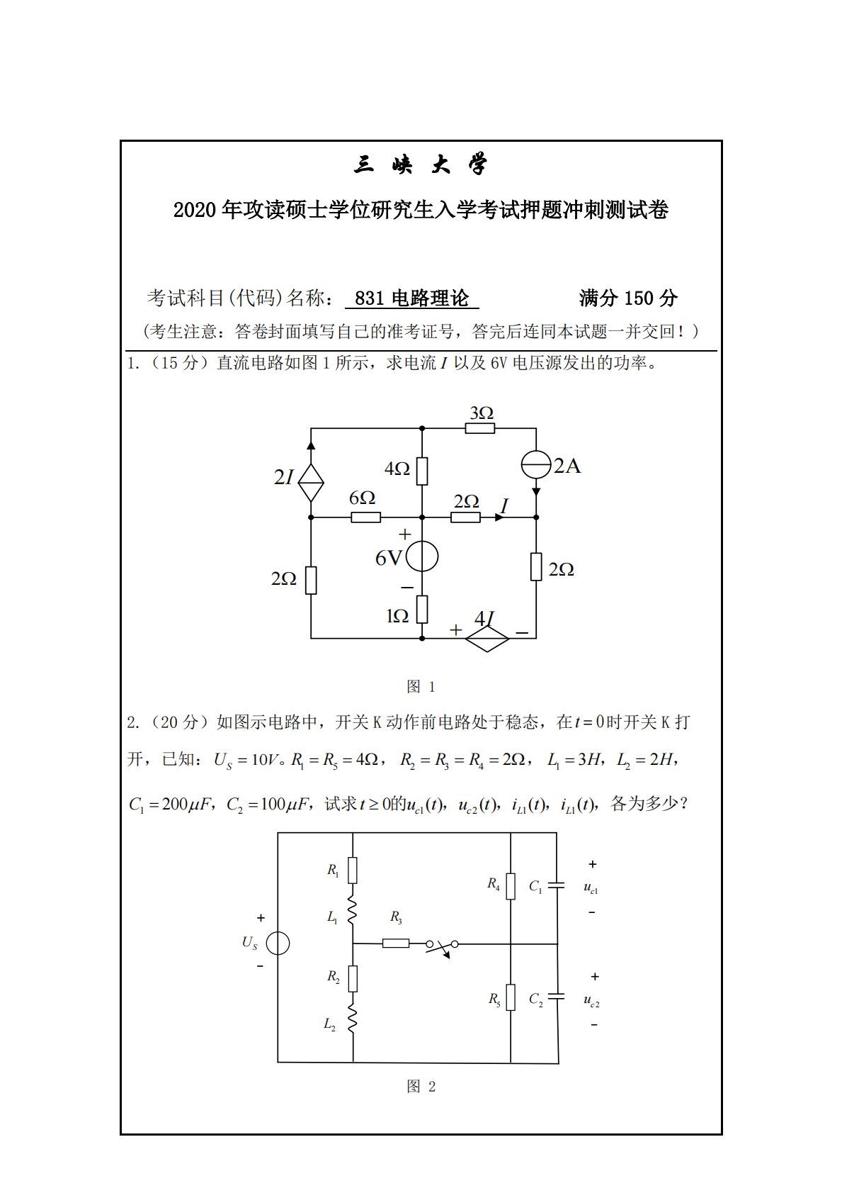 三峡大学2020年攻读硕士学位研究生入学考试押题冲刺测试卷考试科目(代码)名称:831电路理论满分150分(考生注意:答卷封面填写自己的准考证号,答完后连同本试题一并交回!)图1图21.(15分)直流电路如图1所示,求电流I以及6V电压源发出的功率。2I6W4W2W3W2A6V1W2WI2W_++4I_2.(20分)如图示电路中,开关K动作前电路处于稳态,在t=0时开关K打开,已知:US=10V。R1=R5=4W,RRR2=3=4=2W,LHLH1=32=2,,12CFCFµµ=200=100,1211,试求tututitit³0()()()()的ccLL,,,,各为多少?USR1L1R2L2...