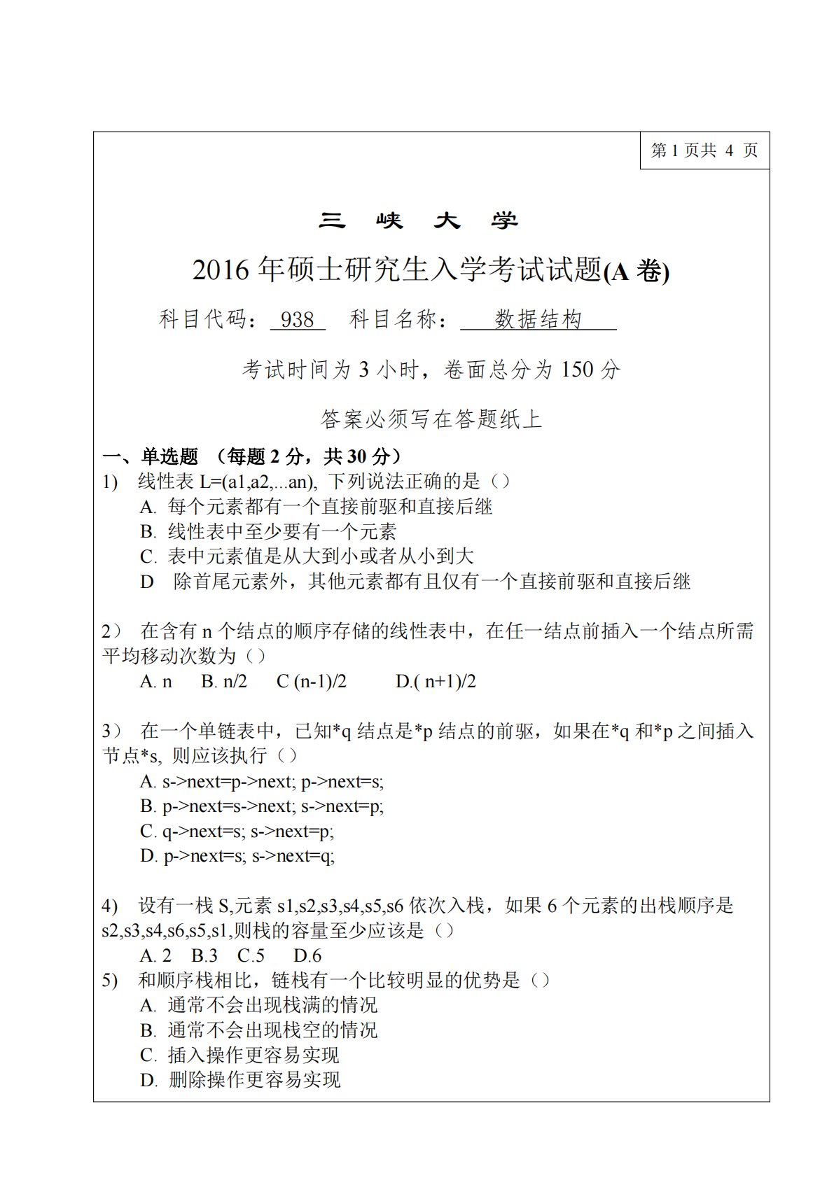 第1页共4页三峡大学2016年硕士研究生入学考试试题(A卷)科目代码:938科目名称:数据结构考试时间为3小时,卷面总分为150分答案必须写在答题纸上一、单选题(每题2分,共30分)1)线性表L=(a1,a2,...an),下列说法正确的是()A.每个元素都有一个直接前驱和直接后继B.线性表中至少要有一个元素C.表中元素值是从大到小或者从小到大D除首尾元素外,其他元素都有且仅有一个直接前驱和直接后继2)在含有n个结点的顺序存储的线性表中,在任一结点前插入一个结点所需平均移动次数为()A.nB.n/2C(n-1)/2D.(n+1)/23)在一个单链表中,已知*q结点是*p结点的前驱,如果在*q和...