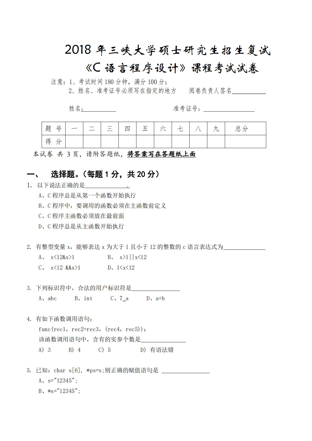 2018年三峡大学硕士研究生招生复试《C语言程序设计》课程考试试卷注意:1、考试时间180分钟,满分100分;2、姓名、准考证号必须写在指定的地方阅卷负责人签名姓名:准考证号:题号一二三四五六七八九总分得分本试卷共3页,请附答题纸,将答案写在答题纸上面一、选择题。(每题1分,共20分)1.以下说法正确的是.A、C程序总是从第一个函数开始执行B、C程序中,要调用的函数必须在主函数前定义C、C程序主函数必须放在最前面D、C程序总是从主函数开始执行2.有整型变量x,能够表达x为大于1且小于12的整数的c语言表达式为A、x1B、x>1||x