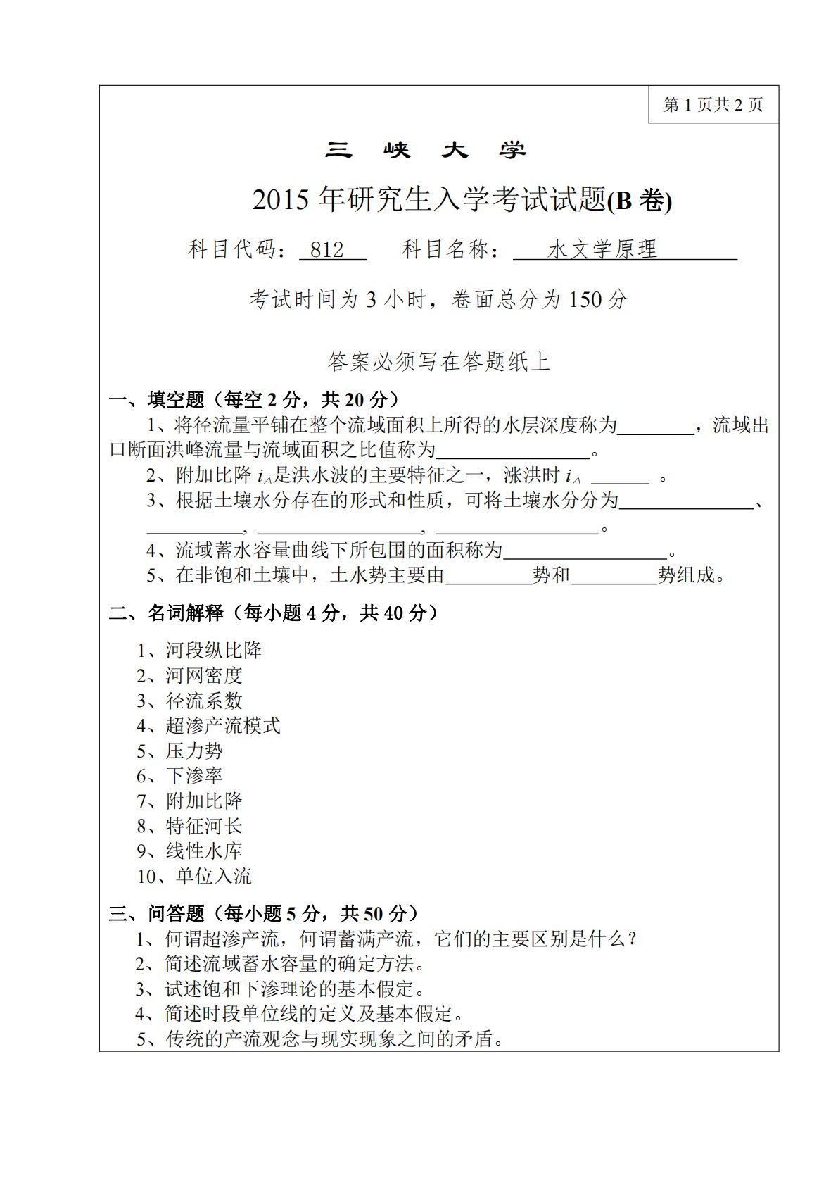第1页共2页三峡大学2015年研究生入学考试试题(B卷)科目代码:812科目名称:水文学原理考试时间为3小时,卷面总分为150分答案必须写在答题纸上一、填空题(每空2分,共20分)1、将径流量平铺在整个流域面积上所得的水层深度称为________,流域出口断面洪峰流量与流域面积之比值称为。2、附加比降i△是洪水波的主要特征之一,涨洪时i△。3、根据土壤水分存在的形式和性质,可将土壤水分分为、,,。4、流域蓄水容量曲线下所包围的面积称为。5、在非饱和土壤中,土水势主要由势和势组成。二、名词解释(每小题4分,共40分)1、河段纵比降2、河网密度3、径流系数4、超渗产流模式5、压力势6、下渗率7、附...