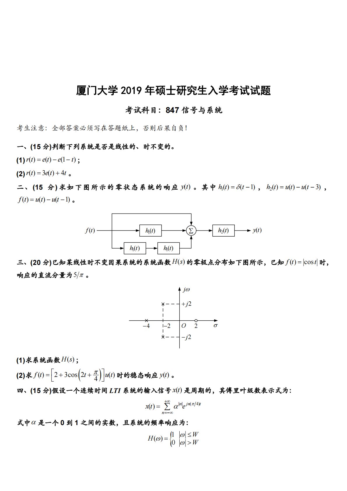 厦门大学2019年硕士研究生入学考试试题考试科目:847信号与系统考生注意:全部答案必须写在答题纸上,否则后果自负!一、(15分)判断下列系统是否是线性的、时不变的。()()(1)(1)rtetet;()3()4(2)rtett。1()(1)二、(15分)求如下图所示的零状态系统的响应y(t)。其中htt2()()(3),htutut,()()(1)ftutut。h1(t)h2(t)h1(t)h1(t)f()ty(t)三、(20分)已知某线性时不变因果系统的系统函数H(s)的零极点分布如下图所示,已知f(t)cost时,响应的直流分量为5。Oj2224...
