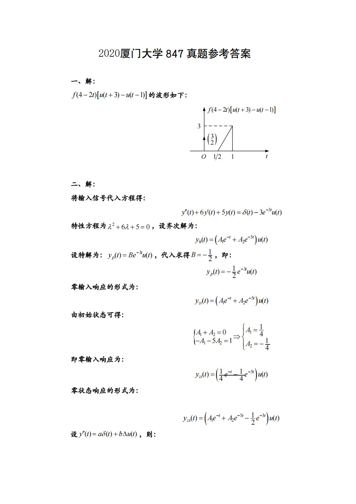20200ÊvЇ5•IsÃ一、解:(42)(3)(1)ftutut的波形如下:Ot1(42)(3)(1)ftutut32123二、解:将输入信号代入方程得:ytytytteut3t()6()5()()3()特性方程为2650,设齐次解为:512h()()ytAeAeutttp()()设特解为:ytBeut3t,代入求得B12,即:2p()()yteut3t1零输入响应的形式为:512zi()()ytAeAeuttt由初始状态可得:1214152114AAAAA1A2...