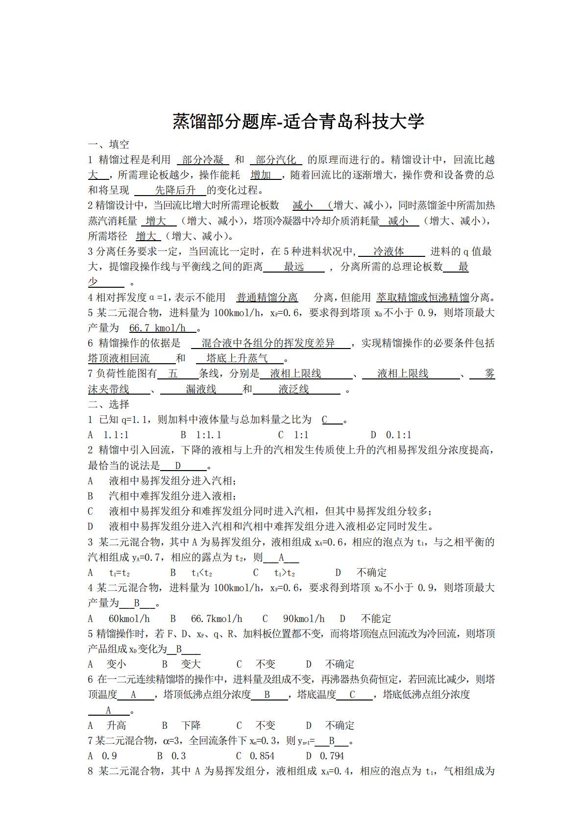 青岛科技大学801化工原理蒸馏部分题库