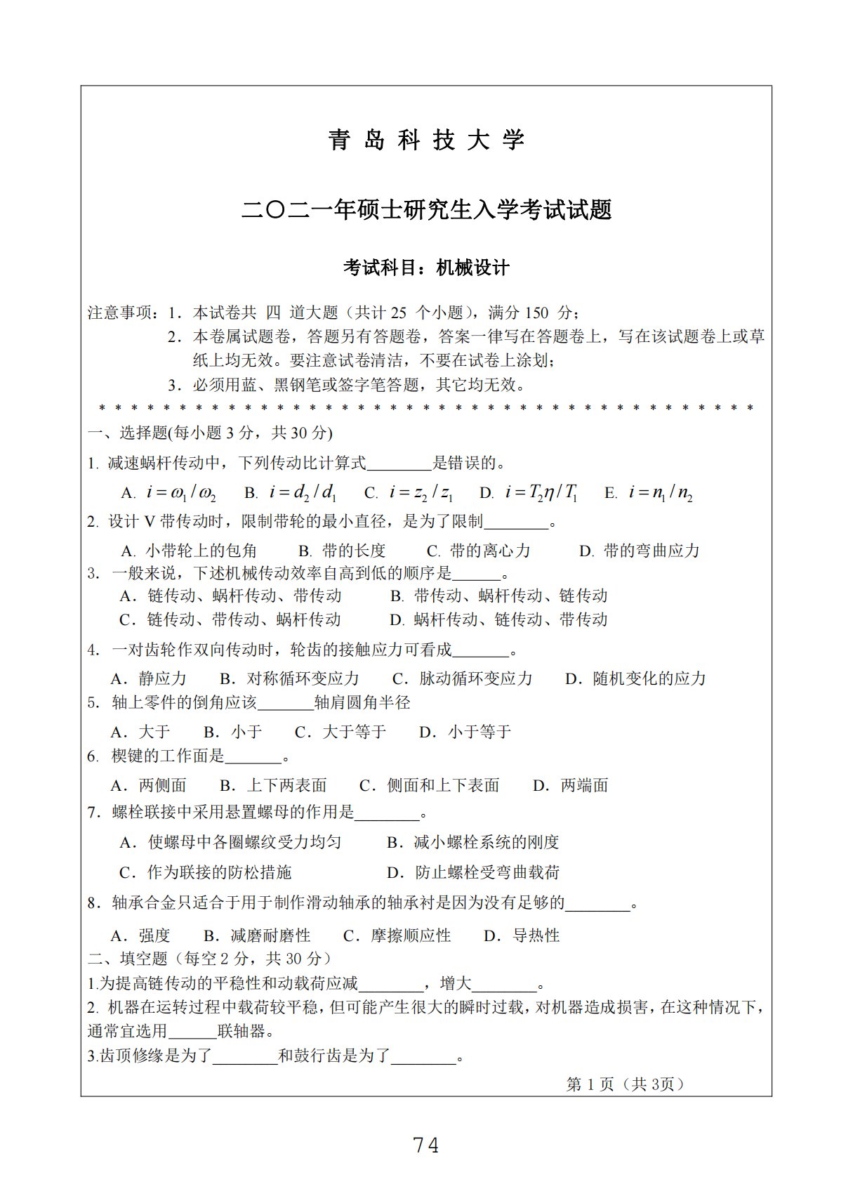 第页(共3页)1青岛科技大学二○二一年硕士研究生入学考试试题考试科目:机械设计注意事项:1.本试卷共四道大题(共计25个小题),满分150分;2.本卷属试题卷,答题另有答题卷,答案一律写在答题卷上,写在该试题卷上或草纸上均无效。要注意试卷清洁,不要在试卷上涂划;3.必须用蓝、黑钢笔或签字笔答题,其它均无效。﹡﹡﹡﹡﹡﹡﹡﹡﹡﹡﹡﹡﹡﹡﹡﹡﹡﹡﹡﹡﹡﹡﹡﹡﹡﹡﹡﹡﹡﹡﹡﹡﹡﹡﹡﹡﹡﹡﹡﹡﹡一、选择题(每小题3分,共30分)1.减速蜗杆传动中,下列传动比计算式是错误的。A.12/iB.21/iddC.21/izzD.21/iTTE.12/inn2.设计V带传动时,限制带轮的最小直径...