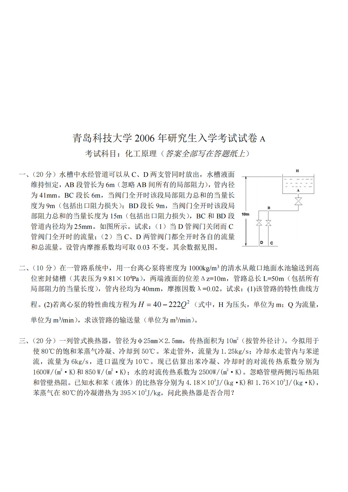 青岛科技大学2006年研究生入学考试试卷A考试科目:化工原理(答案全部写在答题纸上)一、(20分)水槽中水经管道可以从C、D两支管同时放出,水槽液面维持恒定,AB段管长为6m(忽略AB间所有的局部阻力),管内径为41mm。BC段长6m,当阀门全开时该段局部阻力总和的当量长度为9m(包括出口阻力损失);BD段长9m,当阀门全开时该段局部阻力总和的当量长度为15m(包括出口阻力损失),BC和BD段管道内径均为25mm。如图所示。试求:(1)当D管阀门关闭而C管阀门全开时的流量;(2)当C、D两管阀门都全开时各自的流量和总流量。设管内摩擦系数均可取0.03不变。其余数据见图。二、(10分)在一管路系...