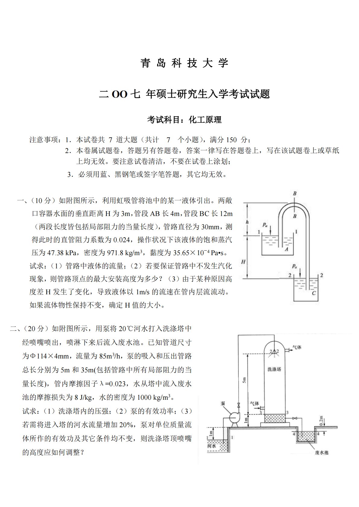 二、(20分)如附图所示,用泵将20℃河水打入洗涤塔中经喷嘴喷出,喷淋下来后流入废水池。已知管道尺寸为Φ114×4mm,流量为85m3/h,泵的吸入和压出管路总长分别为5m和35m(包括管路中所有局部阻力的当量长度),管内摩擦因子λ=0.023,水从塔中流入废水池的摩擦损失为8J/kg,水的密度为1000kg/m3。试求:(1)洗涤塔内的压强;(2)泵的有效功率;(3)若需将进入塔的河水流量增加20%,泵对单位质量流体所作的有效功及其它条件均不变,则洗涤塔顶喷嘴的高度应如何调整?青岛科技大学二OO七年硕士研究生入学考试试题考试科目:化工原理注意事项:1.本试卷共7道大题(共计7个小题),满分1...