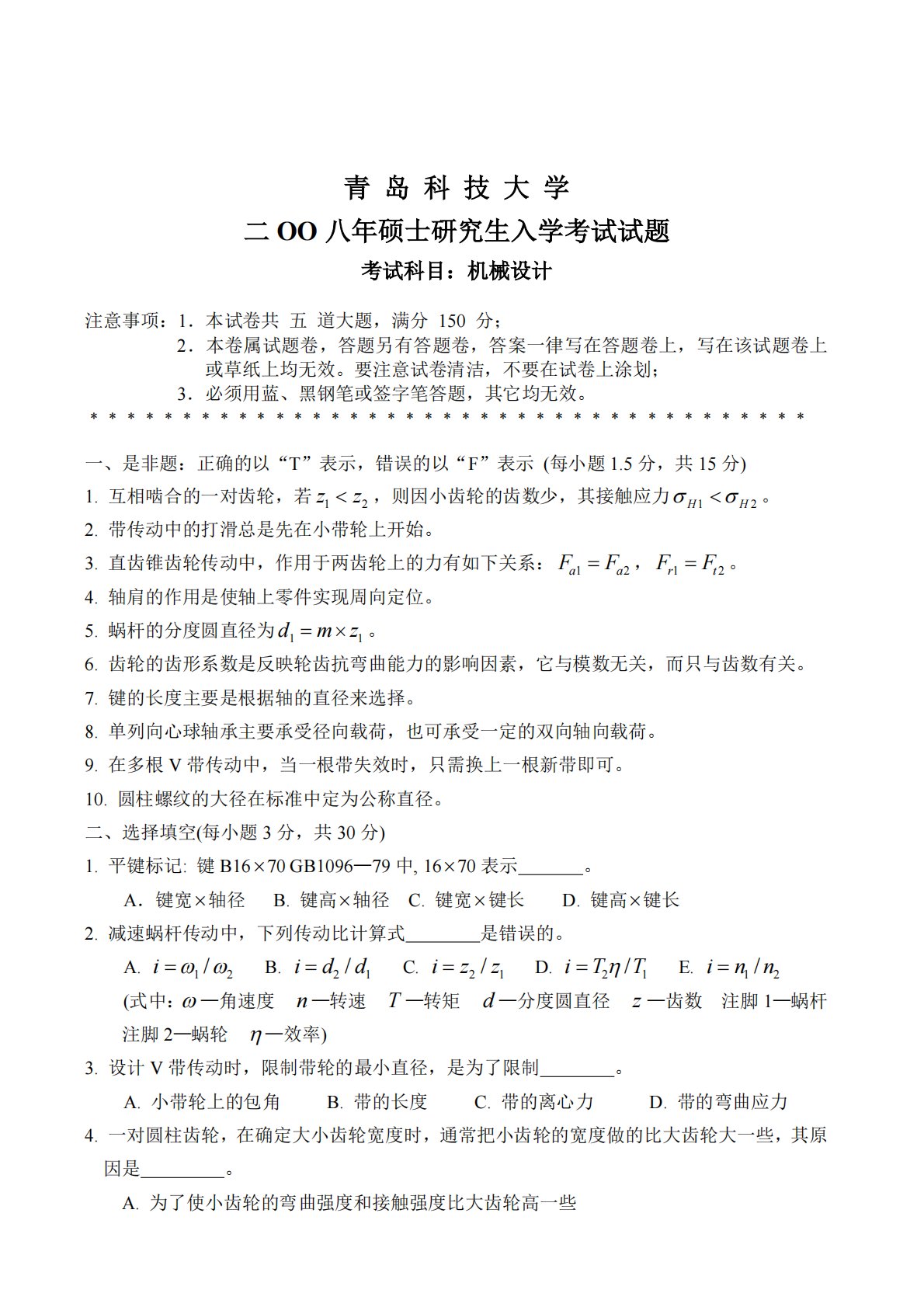 青岛科技大学二OO八年硕士研究生入学考试试题考试科目:机械设计注意事项:1.本试卷共五道大题,满分150分;2.本卷属试题卷,答题另有答题卷,答案一律写在答题卷上,写在该试题卷上或草纸上均无效。要注意试卷清洁,不要在试卷上涂划;3.必须用蓝、黑钢笔或签字笔答题,其它均无效。﹡﹡﹡﹡﹡﹡﹡﹡﹡﹡﹡﹡﹡﹡﹡﹡﹡﹡﹡﹡﹡﹡﹡﹡﹡﹡﹡﹡﹡﹡﹡﹡﹡﹡﹡﹡﹡﹡﹡一、是非题:正确的以“T”表示,错误的以“F”表示(每小题1.5分,共15分)1.互相啮合的一对齿轮,若z1z2,则因小齿轮的齿数少,其接触应力H1H2。2.带传动中的打滑总是先在小带轮上开始。3.直齿锥齿轮传动中,作用于两齿轮上的力有如下...