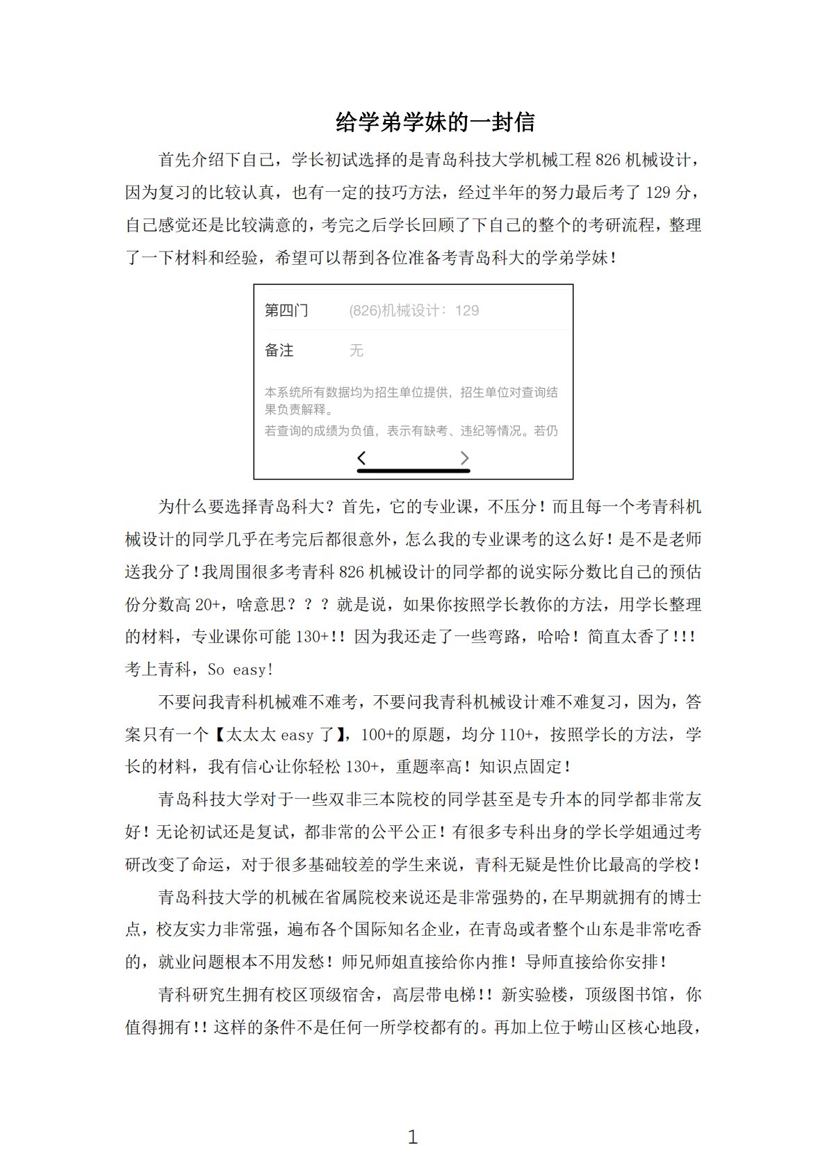 给学弟学妹的一封信首先介绍下自己,学长初试选择的是青岛科技大学机械工程826机械设计,因为复习的比较认真,也有一定的技巧方法,经过半年的努力最后考了129分,自己感觉还是比较满意的,考完之后学长回顾了下自己的整个的考研流程,整理了一下材料和经验,希望可以帮到各位准备考青岛科大的学弟学妹!为什么要选择青岛科大?首先,它的专业课,不压分!而且每一个考青科机械设计的同学几乎在考完后都很意外,怎么我的专业课考的这么好!是不是老师送我分了!我周围很多考青科826机械设计的同学都的说实际分数比自己的预估份分数高20+,啥意思???就是说,如果你按照学长教你的方法,用学长整理的材料,专业课你可能130+!!...