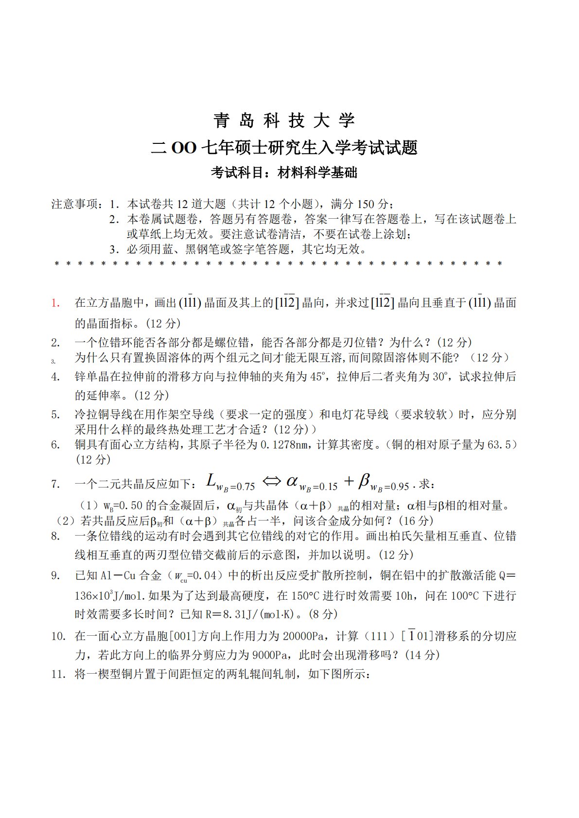 青岛科技大学二OO七年硕士研究生入学考试试题考试科目:材料科学基础注意事项:1.本试卷共12道大题(共计12个小题),满分150分;2.本卷属试题卷,答题另有答题卷,答案一律写在答题卷上,写在该试题卷上或草纸上均无效。要注意试卷清洁,不要在试卷上涂划;3.必须用蓝、黑钢笔或签字笔答题,其它均无效。﹡﹡﹡﹡﹡﹡﹡﹡﹡﹡﹡﹡﹡﹡﹡﹡﹡﹡﹡﹡﹡﹡﹡﹡﹡﹡﹡﹡﹡﹡﹡﹡﹡﹡﹡﹡﹡﹡﹡1.2.3.4.5.6.7.在立方晶胞中,画出(111)晶面及其上的[112]晶向,并求过[112]晶向且垂直于(111)晶面的晶面指标。(12分)一个位错环能否各部分都是螺位错,能否各部分都是刃位错?为什么?(12分)为什...