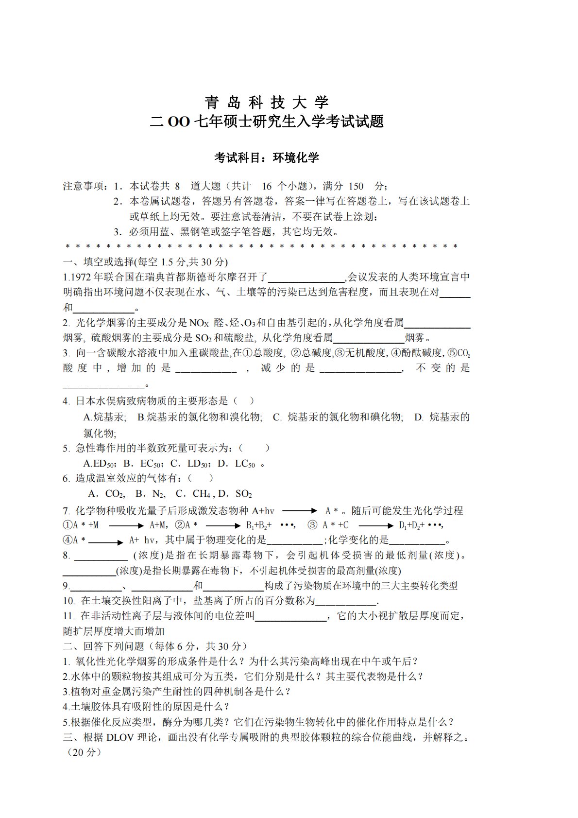 二OO七年硕士研究生入学考试试青岛科技大学题考试科目:环境化学注意事项:1.本试卷共8道大题(共计16个小题),满分150分;2.本卷属试题卷,答题另有答题卷,答案一律写在答题卷上,写在该试题卷上或草纸上均无效。要注意试卷清洁,不要在试卷上涂划;3.必须用蓝、黑钢笔或签字笔答题,其它均无效。﹡﹡﹡﹡﹡﹡﹡﹡﹡﹡﹡﹡﹡﹡﹡﹡﹡﹡﹡﹡﹡﹡﹡﹡﹡﹡﹡﹡﹡﹡﹡﹡﹡﹡﹡﹡﹡﹡﹡一、填空或选择(每空1.5分,共30分)1.1972年联合国在瑞典首都斯德哥尔摩召开了_______________,会议发表的人类环境宣言中明确指出环境问题不仅表现在水、气、土壤等的污染已达到危害程度,而且表现在对______和...