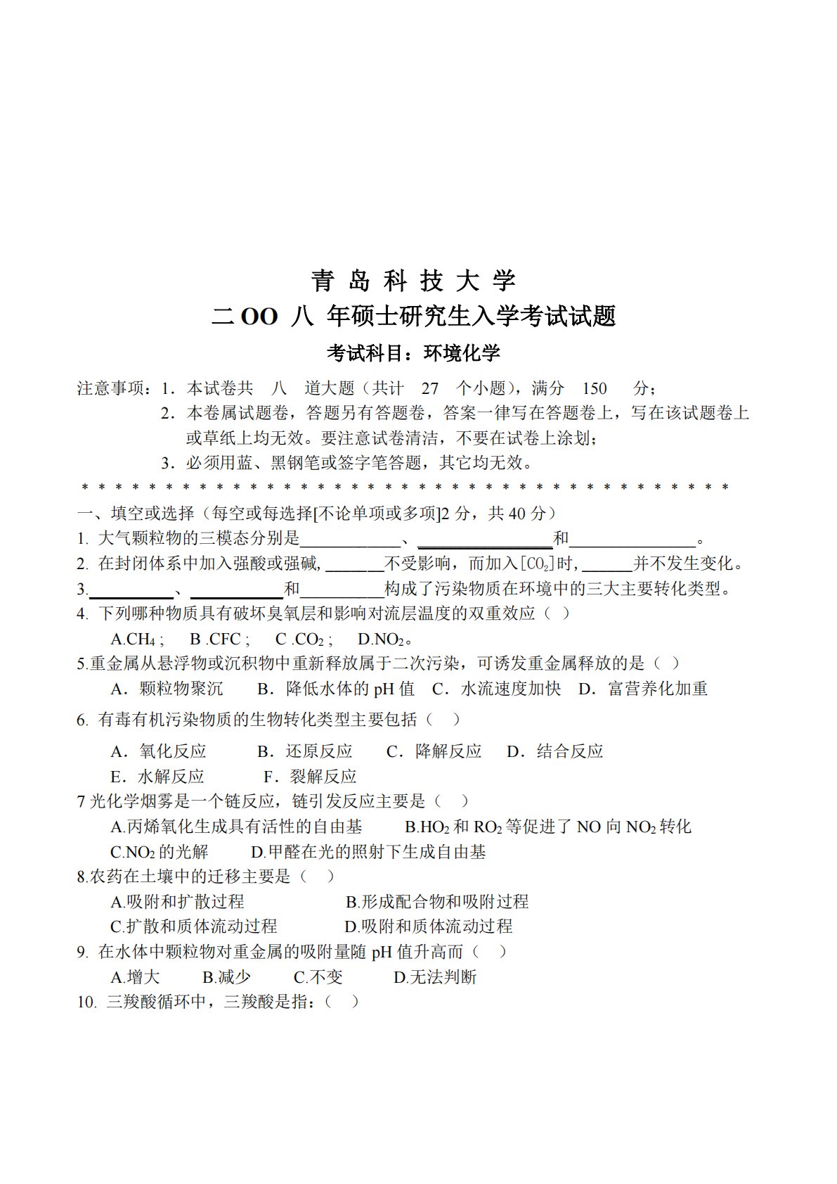 青岛科技大学二OO八年硕士研究生入学考试试题考试科目:环境化学注意事项:1.本试卷共八道大题(共计27个小题),满分150分;2.本卷属试题卷,答题另有答题卷,答案一律写在答题卷上,写在该试题卷上或草纸上均无效。要注意试卷清洁,不要在试卷上涂划;3.必须用蓝、黑钢笔或签字笔答题,其它均无效。﹡﹡﹡﹡﹡﹡﹡﹡﹡﹡﹡﹡﹡﹡﹡﹡﹡﹡﹡﹡﹡﹡﹡﹡﹡﹡﹡﹡﹡﹡﹡﹡﹡﹡﹡﹡﹡﹡﹡一、填空或选择(每空或每选择[不论单项或多项]2分,共40分)1.大气颗粒物的三模态分别是____________、________________和_______________。2.在封闭体系中加入强酸或强碱,_______不...