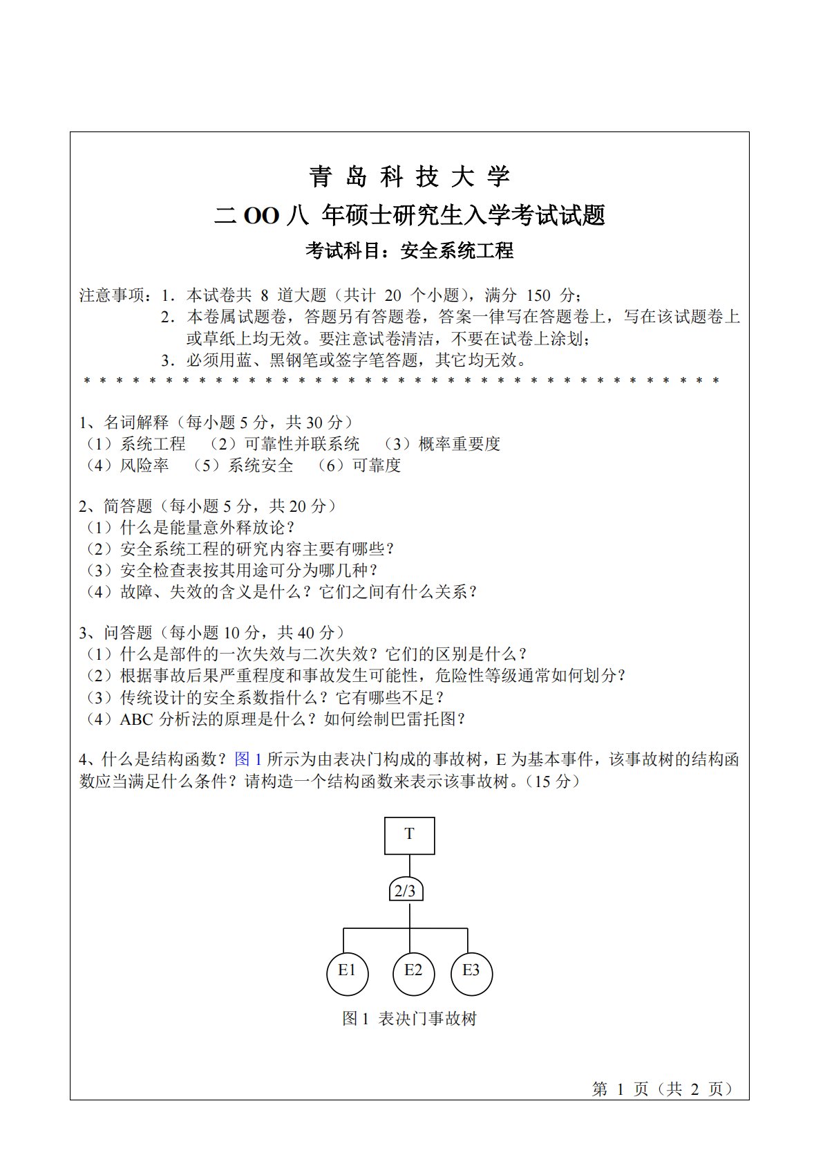 青岛科技大学二OO八年硕士研究生入学考试试题考试科目:安全系统工程注意事项:1.本试卷共8道大题(共计20个小题),满分150分;2.本卷属试题卷,答题另有答题卷,答案一律写在答题卷上,写在该试题卷上或草纸上均无效。要注意试卷清洁,不要在试卷上涂划;3.必须用蓝、黑钢笔或签字笔答题,其它均无效。﹡﹡﹡﹡﹡﹡﹡﹡﹡﹡﹡﹡﹡﹡﹡﹡﹡﹡﹡﹡﹡﹡﹡﹡﹡﹡﹡﹡﹡﹡﹡﹡﹡﹡﹡﹡﹡﹡﹡1、名词解释(每小题5分,共30分)(1)系统工程(2)可靠性并联系统(3)概率重要度(4)风险率(5)系统安全(6)可靠度2、简答题(每小题5分,共20分)(1)什么是能量意外释放论?(2)安全系统工程的研究内容主要有哪些?...