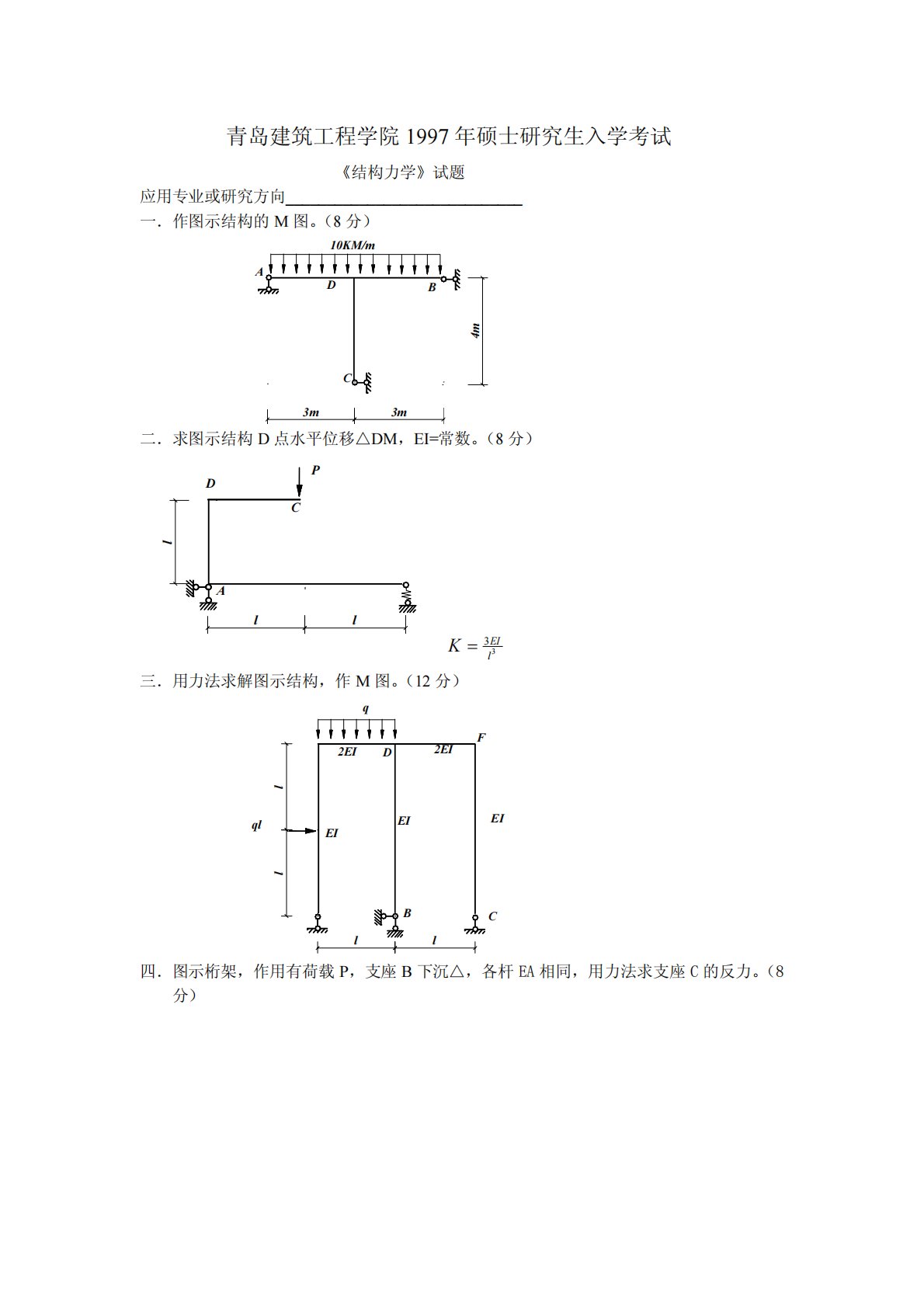 青岛建筑工程学院1997年硕士研究生入学考试《结构力学》试题应用专业或研究方向_____________________________一.作图示结构的M图。(8分)3m3mCAD10KM/mB4m二.求图示结构D点水平位移△DM,EI=常数。(8分)lAlDlCP33EIKl=三.用力法求解图示结构,作M图。(12分)EICqllllBEID2EIlEIq2EIF四.图示桁架,作用有荷载P,支座B下沉△,各杆EA相同,用力法求支座C的反力。(8分)AllBlΔDP五.用位移法计算图示结构,并作M图。EI=常数。(12分)11KN/m2m2m3m2mAEBDC六.用力矩分配法求解图示结构,作出...
