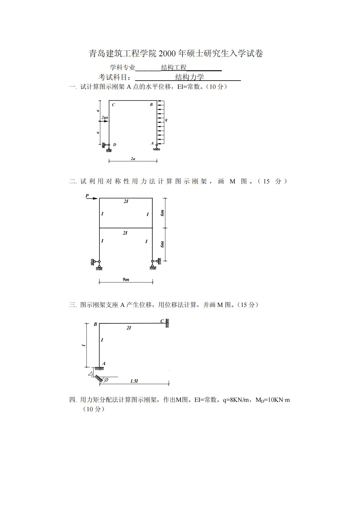 青岛建筑工程学院2000年硕士研究生入学试卷学科专业________结构工程___________考试科目:结构力学一.试计算图示刚架A点的水平位移,EI=常数。(10分)DCaa2qaBAq2a二.试利用对称性用力法计算图示刚架,画M图。(15分)9m6m6m2I2IIIIIP三.图示刚架支座A产生位移,用位移法计算,并画M图。(15分)1.5llAIB2IC四.用力矩分配法计算图示刚架,作出M图。EI=常数。q=8KN/m,MD=10KN·m(10分)4m4m4mDCABMq五.用矩阵位移法计算图示连续梁,并画M图,EI=常数。q=12KN/,l=6m。(15分)qlll六.作图示桁架指定...