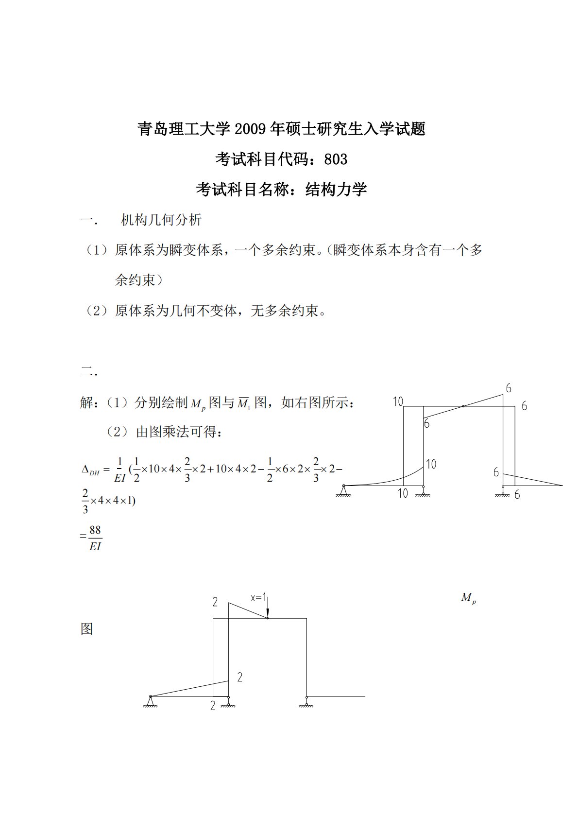 青岛理工大学2009年硕士研究生入学试题考试科目代码:803考试科目名称:结构力学一.机构几何分析(1)原体系为瞬变体系,一个多余约束。(瞬变体系本身含有一个多余约束)(2)原体系为几何不变体,无多余约束。二.解:(1)分别绘制Mp___图与M1图,如右图所示:(2)由图乘法可得:122312232DHE1I(104210426223441)=88EIMp图___1M图二.解:(1)由图可知CAEDF为附属结构,受力分析如右图所示:(2)由0AM得30CDFxF(06x)得3CDxF(06x)又3BCDMFx(06x)(3)由...