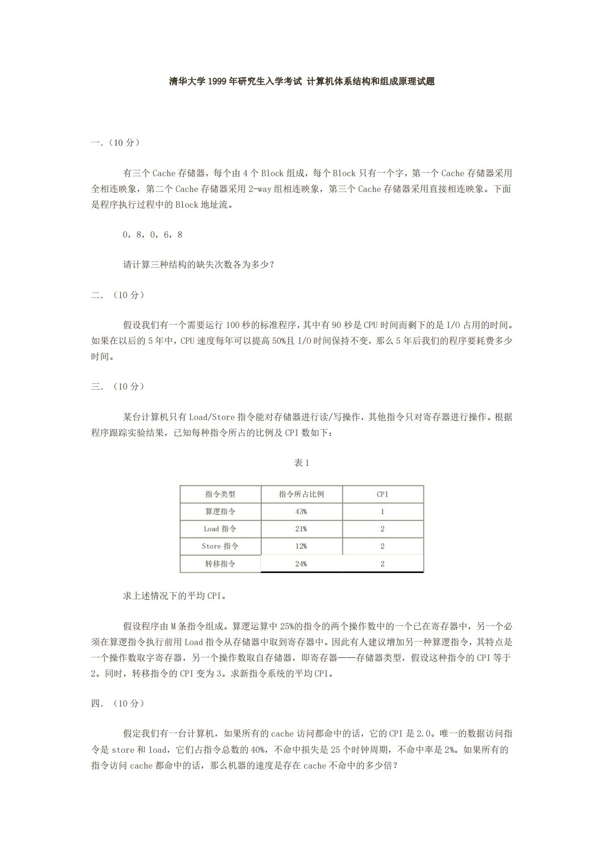 清华大学1999年研究生入学考试计算机体系结构和组成原理试题一.(10分)有三个Cache存储器,每个由4个Block组成,每个Block只有一个字,第一个Cache存储器采用全相连映象,第二个Cache存储器采用2-way组相连映象,第三个Cache存储器采用直接相连映象。下面是程序执行过程中的Block地址流。0,8,0,6,8请计算三种结构的缺失次数各为多少?二.(10分)假设我们有一个需要运行100秒的标准程序,其中有90秒是CPU时间而剩下的是I/O占用的时间。如果在以后的5年中,CPU速度每年可以提高50%且I/O时间保持不变,那么5年后我们的程序要耗费多少时间。三.(10分)某台...