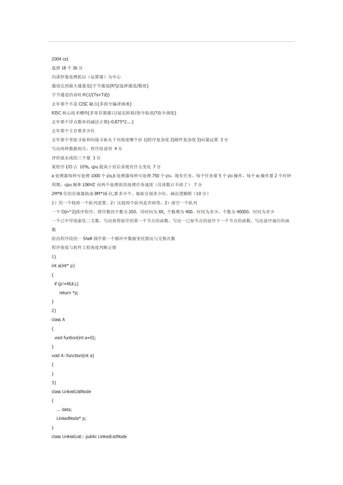 转载自:http://bbs.topkaoyan.net/viewthread.php?tid=1110072004cs1选择18个36分冯诺伊曼处理机以(运算器)为中心通道达到最大通量是(字节通道(R?)/选择通道/数组)字节通道的吞吐率(1/(Ts+Td))去年那个不是CISC缺点(多指令编译困难)RISC核心技术哪些(多寄存器窗口/延迟转移/指令取消/?指令调度)去年那个浮点数补码减法计算(-0.875*2....)去年那个主存要多少位去年那个变址寻址和间接寻址从下列角度哪个好1)程序复杂度2)硬件复杂度3)向量运算3分写出两种数据相关,程序段说明4分评价流水线的三个量3分某程序I/O占...