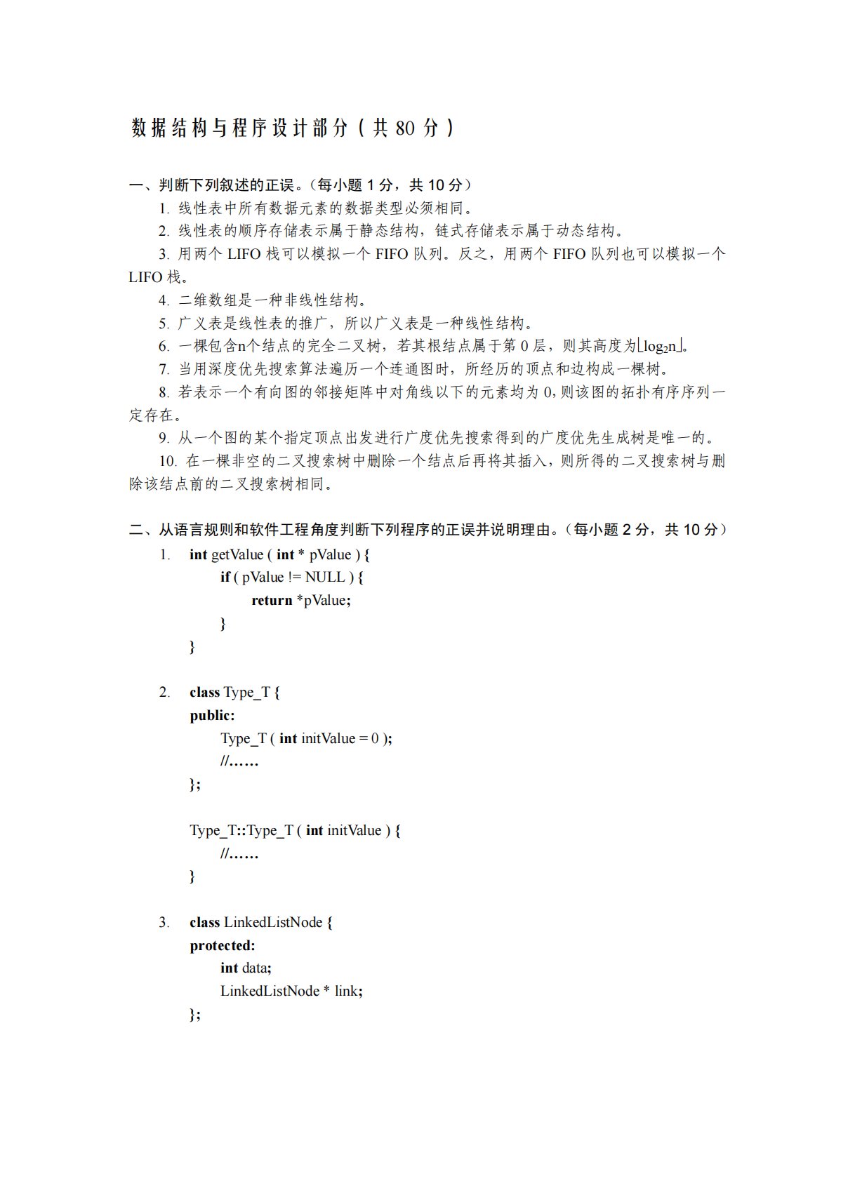 数据结构与程序设计部分(共80分)一、判断下列叙述的正误。(每小题1分,共10分)1.线性表中所有数据元素的数据类型必须相同。2.线性表的顺序存储表示属于静态结构,链式存储表示属于动态结构。3.用两个LIFO栈可以模拟一个FIFO队列。反之,用两个FIFO队列也可以模拟一个LIFO栈。4.二维数组是一种非线性结构。5.广义表是线性表的推广,所以广义表是一种线性结构。6.一棵包含n个结点的完全二叉树,若其根结点属于第0层,则其高度为⎣log2n⎦。7.当用深度优先搜索算法遍历一个连通图时,所经历的顶点和边构成一棵树。8.若表示一个有向图的邻接矩阵中对角线以下的元素均为0,则该图的拓扑有序序列一定...