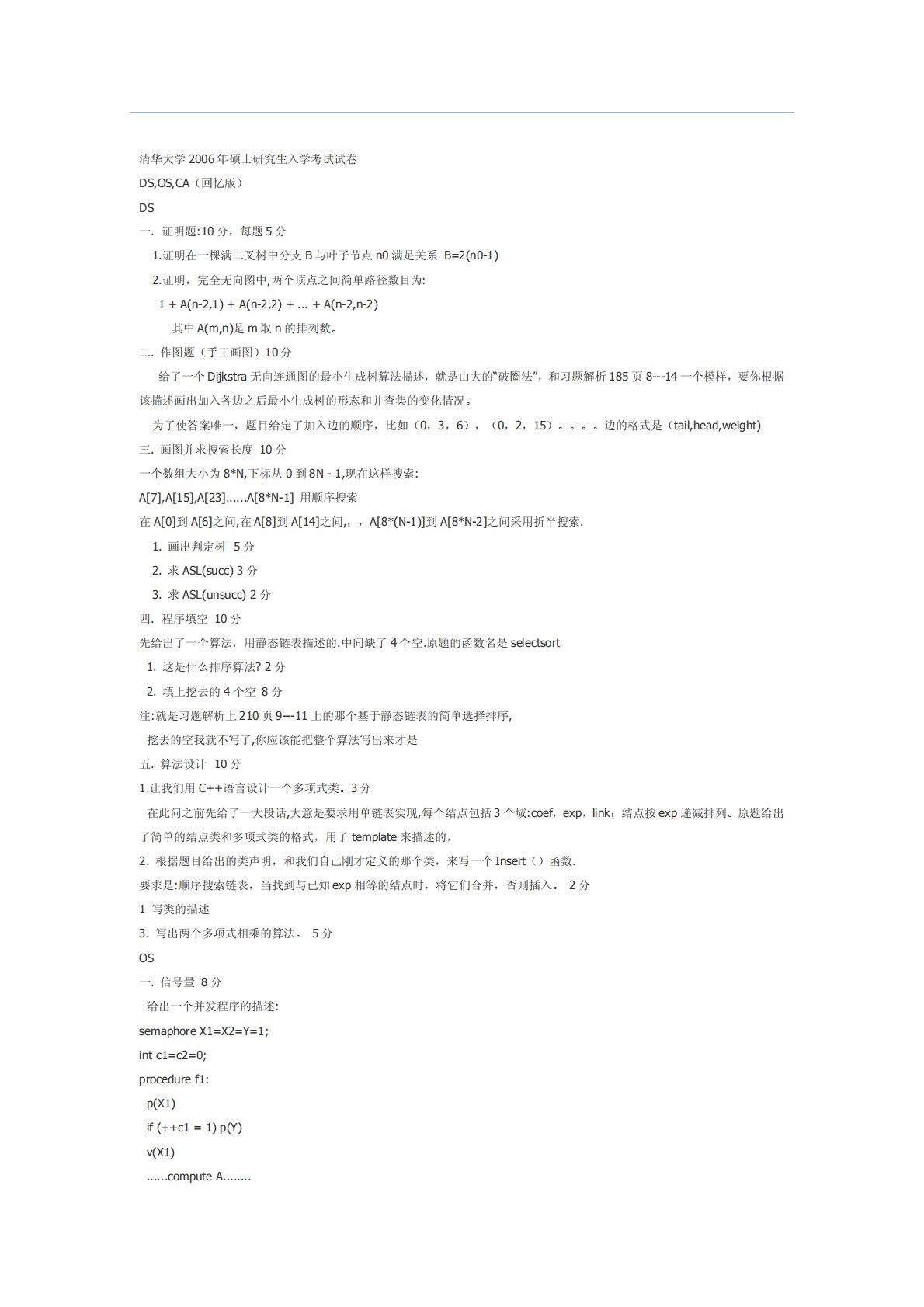 转载自:http://bbs.topkaoyan.net/viewthread.php?tid=111007清华大学2006年硕士研究生入学考试试卷DS,OS,CA(回忆版)DS一.证明题:10分,每题5分1.证明在一棵满二叉树中分支B与叶子节点n0满足关系B=2(n0-1)2.证明,完全无向图中,两个顶点之间简单路径数目为:1+A(n-2,1)+A(n-2,2)+...+A(n-2,n-2)其中A(m,n)是m取n的排列数。二.作图题(手工画图)10分给了一个Dijkstra无向连通图的最小生成树算法描述,就是山大的“破圈法”,和习题解析185页8---14一个模样,要你根据该描述画出加入各...