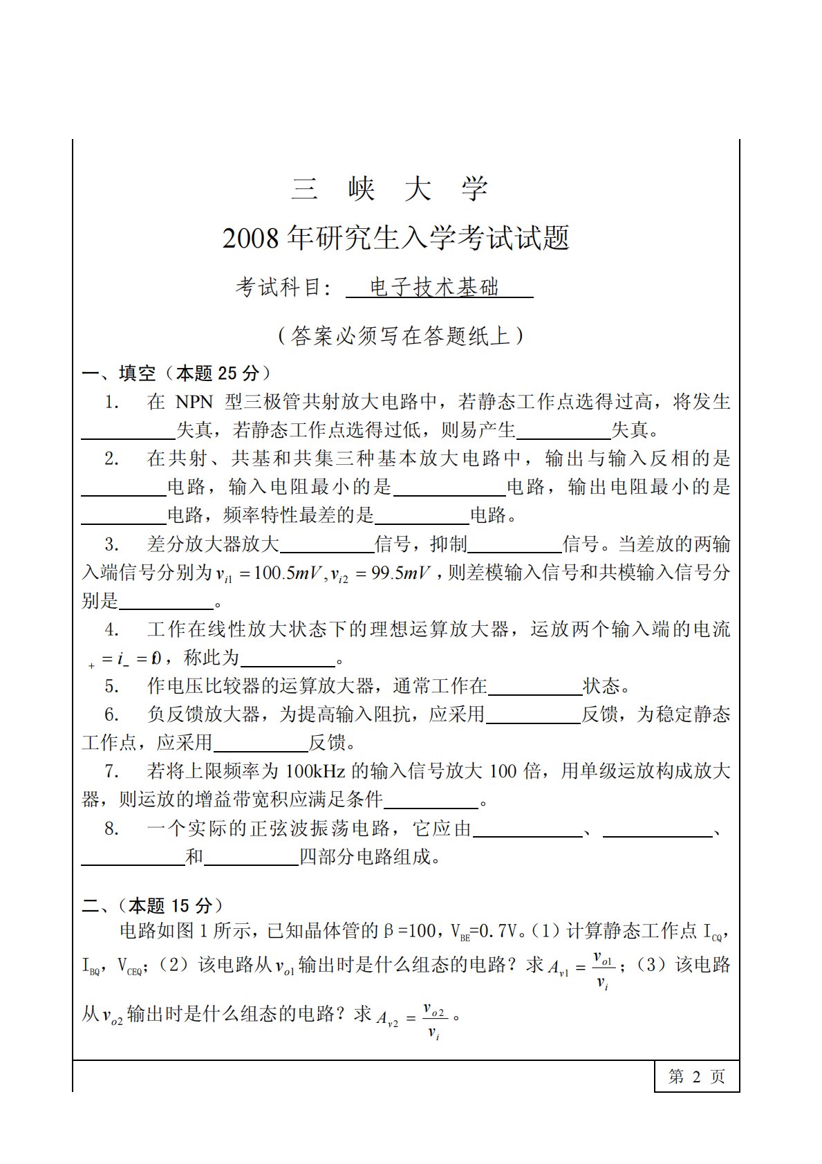 三峡大学2008年研究生入学考试试题考试科目:电子技术基础(答案必须写在答题纸上)一、填空(本题25分)1.在NPN型三极管共射放大电路中,若静态工作点选得过高,将发生失真,若静态工作点选得过低,则易产生失真。2.在共射、共基和共集三种基本放大电路中,输出与输入反相的是电路,输出电阻最小的是电路,输入电阻最小的是电路,频率特性最差的是电路。3.差分放大器放大信号,抑制信号。当差放的两输入端信号分别为vi1100.5mV,vi299.5mV,则差模输入信号和共模输入信号分别是4.。工作在线性放大状态下的理想运算放大器,运放两个输入端的电流0,称此为ii。作电压比较器的运算放大器,通常...