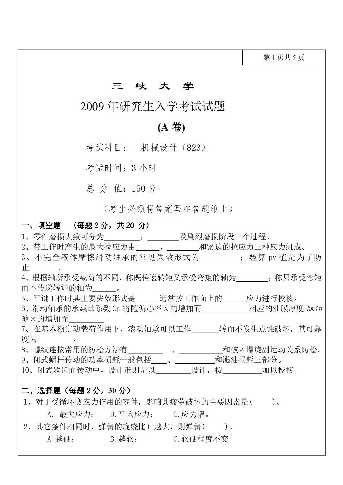 第1页共5页三峡大学2009年研究生入学考试试题(A卷)考试科目:机械设计(823)考试时间:3小时总分值:150分一、填空题(考生必须将答案写在答题纸上)(每题2分,共20分);及剧烈磨损阶段三个过程。1、零件磨损大致可分为2、带工作时产生的最大拉应力由、和紧边的拉应力三种应力组成。3、不完全液体摩擦滑动轴承的常见失效形式为;验算pv值是为了防止。4、根据轴所承受载荷的不同,称既传递转矩又承受弯矩的轴为;称只承受弯矩而不传递转矩的轴为。5、平键工作时其主要失效形式是通常按工作面上的应力进行校核。相应的油膜厚度hmin6、滑动轴承的承载量系数Cp将随偏心率χ的增加而随χ的增加而7、在基本额定动...