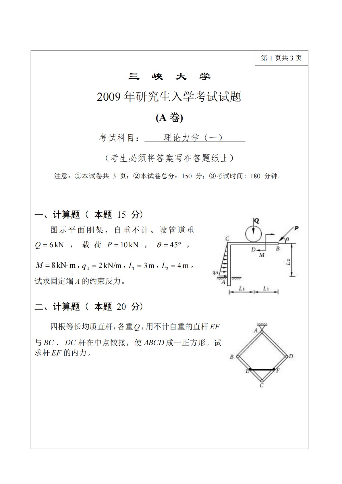 第1页共3页三峡大学2009年研究生入学考试试题(A卷)考试科目:理论力学(一)(考生必须将答案写在答题纸上)注意:①本试卷共3页;②本试卷总分:150分;③考试时间:180分钟。一、计算题(本题15分)图示平面刚架,自重不计。设管道重Q6kN,载荷P10kN,45,M8kNm,qA2kN/m,L13m,L24m。试求固定端A的约束反力。二、计算题(本题20分)四根等长均质直杆,各重Q,用不计自重的直杆EF与BC、DC杆在中点铰接,使ABCD成一正方形。试求杆EF的内力。三、计算题(本题20分)在图示机构中,已知:曲柄OA上作用一力偶,其矩为M,在滑块D上作用水平力P,尺寸...