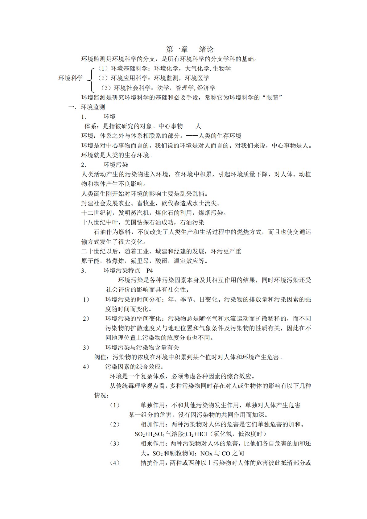 第一章绪论环境监测是环境科学的分支,是所有环境科学的分支学科的基础。(1)环境基础科学:环境化学,大气化学,生物学环境科学(2)环境应用科学:环境监测,环境医学(3)环境社会科学:法学,管理学,经济学环境监测是研究环境科学的基础和必要手段,常称它为环境科学的“眼睛”一.环境监测1.环境体系:是指被研究的对象。中心事物——人环境:体系之外与体系相联系的部分。——人类的生存环境环境是对中心事物而言的,我们说的环境是对人而言的。对我们来说,中心事物是人。环境就是人类的生存环境。2.环境污染人类活动产生的污染物进入环境,在环境中积累,引起环境质量下降,对人体、动植物和物体产生不良影响。人类诞生刚开始对...