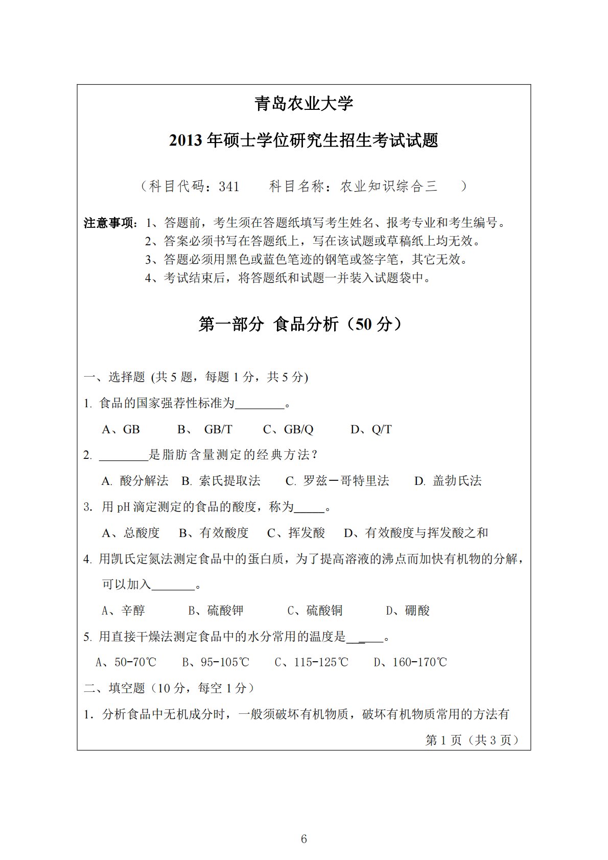 青岛农业大学2013年硕士学位研究生招生考试试题(科目代码:341科目名称:农业知识综合三)注意事项:1、答题前,考生须在答题纸填写考生姓名、报考专业和考生编号。2、答案必须书写在答题纸上,写在该试题或草稿纸上均无效。3、答题必须用黑色或蓝色笔迹的钢笔或签字笔,其它无效。4、考试结束后,将答题纸和试题一并装入试题袋中。第一部分食品分析(50分)一、选择题(共5题,每题1分,共5分)1.食品的国家强荐性标准为。A、GBB、GB/TC、GB/QD、Q/T2.是脂肪含量测定的经典方法?A.酸分解法B.索氏提取法C.罗兹-哥特里法D.盖勃氏法3.用pH滴定测定的食品的酸度,称为_____。A、总酸度B...