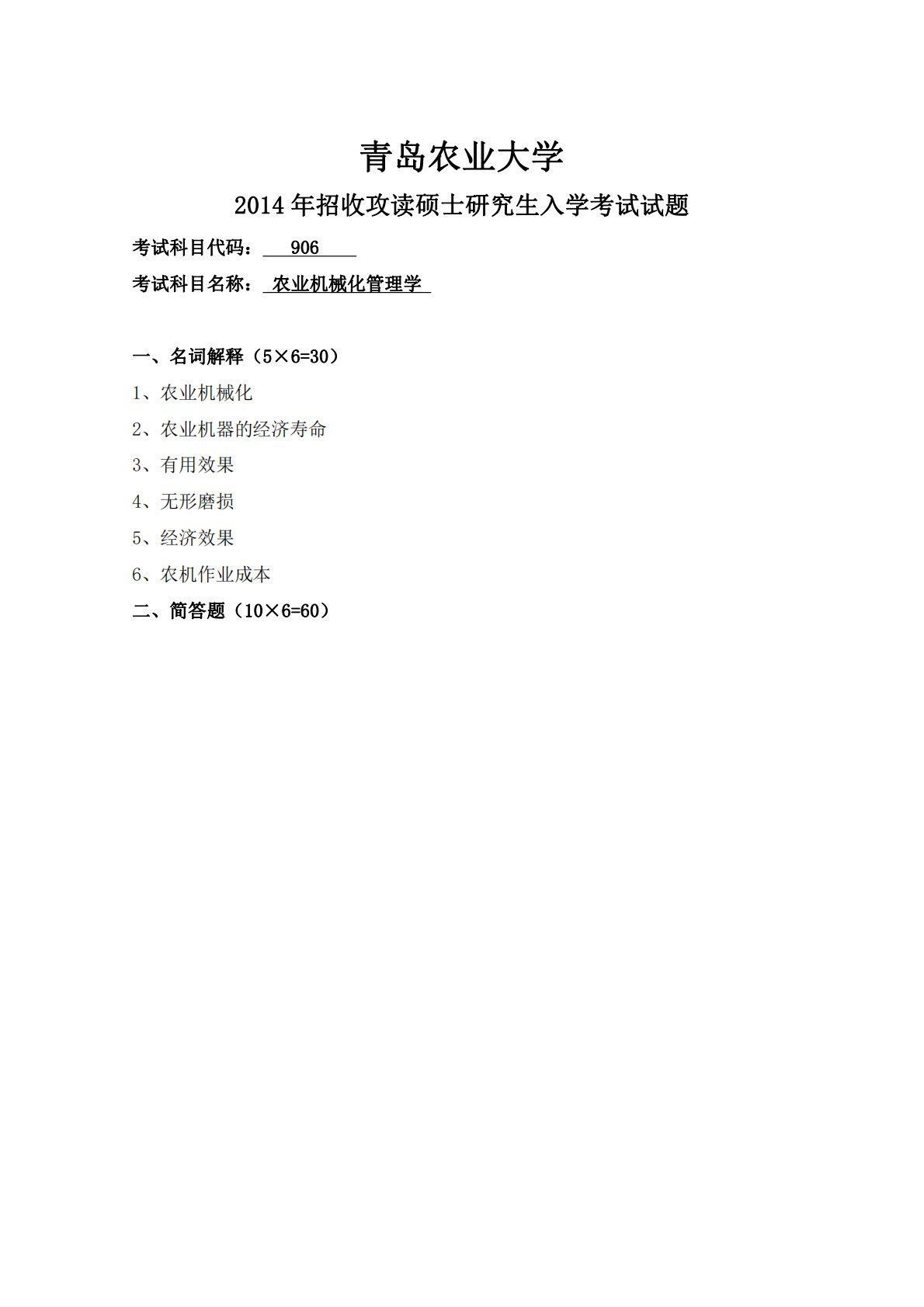 青岛农业大学2014年招收攻读硕士研究生入学考试试题考试科目代码:906考试科目名称:农业机械化管理学一、名词解释(5×6=30)1、农业机械化2、农业机器的经济寿命3、有用效果4、无形磨损5、经济效果6、农机作业成本二、简答题(10×6=60)青岛农业大学2014年招收攻读硕士研究生入学考试试题考试科目代码:906考试科目名称:农业机械化管理学一、名词解释(5×6=30)1、农业机械化2、农业机器的经济寿命3、有用效果4、无形磨损5、经济效果6、农机作业成本二、简答题(10×6=60)1、农业机械化管理的基本方法有哪些?2、我国农业机械化管理体系由哪几方面组成?3、农业机械化可行性研究的程序...
