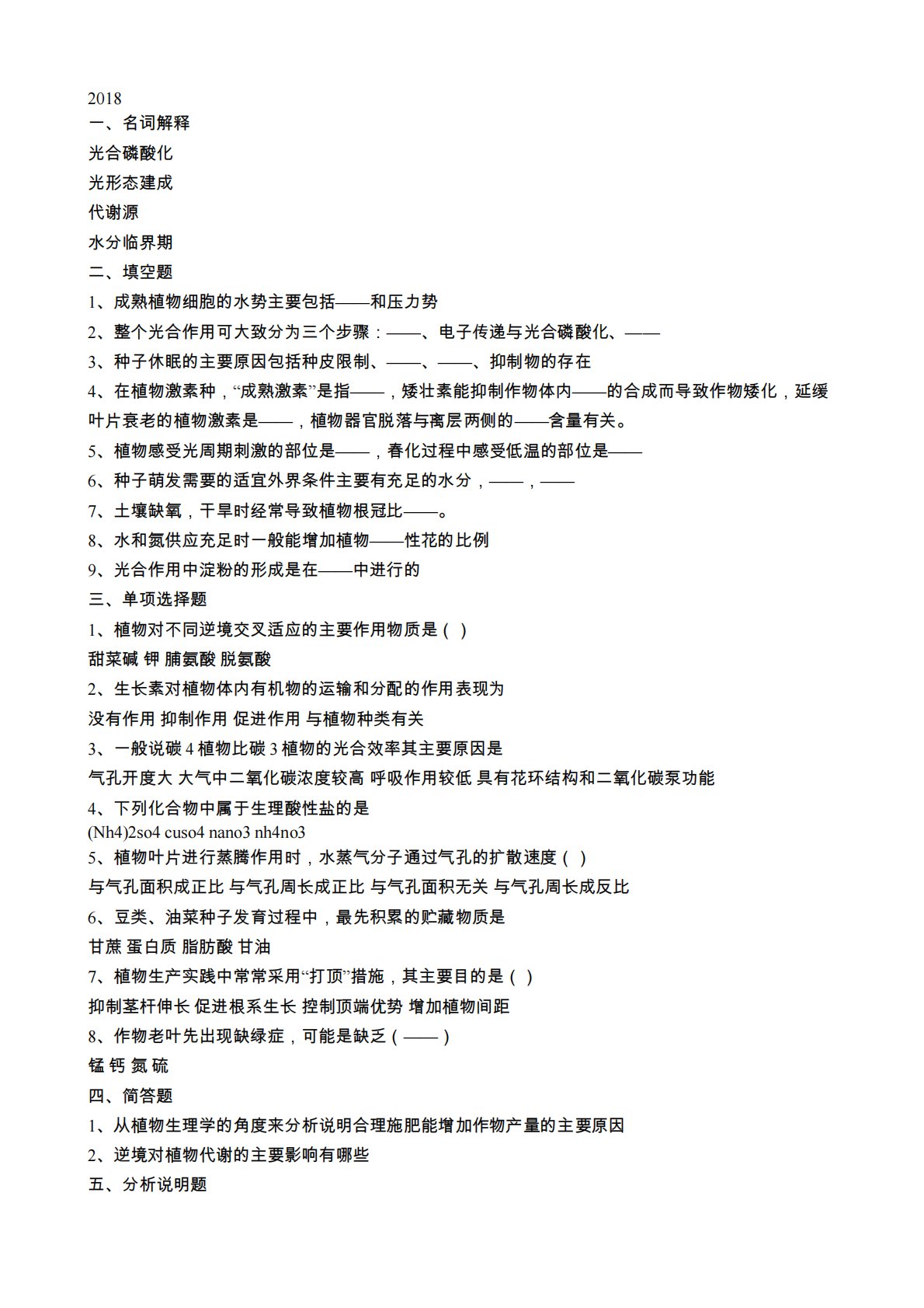 2018一、名词释光合磷酸化光形态建成代谢源水分临界期二、填空题1、成熟植物细胞的水势主要包括——和压力势2、整个光合作用可大致分为三个步骤:——、电子传递与光合磷酸化、——3、种子休眠的主要原因包括种皮限制、——、——、抑制物的存在4、在植物激素种,“成熟激素”是指——,矮壮素能抑制作物体内——的合成而导致作物矮化,延缓叶片衰老的植物激素是——,植物器官脱落与离层两侧的——含量有关。5、植物感受光周期刺激的部位是——,春化过程中感受低温的部位是——6、种子萌发需要的适宜外界条件主要有充足的水分,——,——7、土壤缺氧,干旱时经常导致植物根冠比——。8、水和氮供应充足时一般能增加植物——性花的...