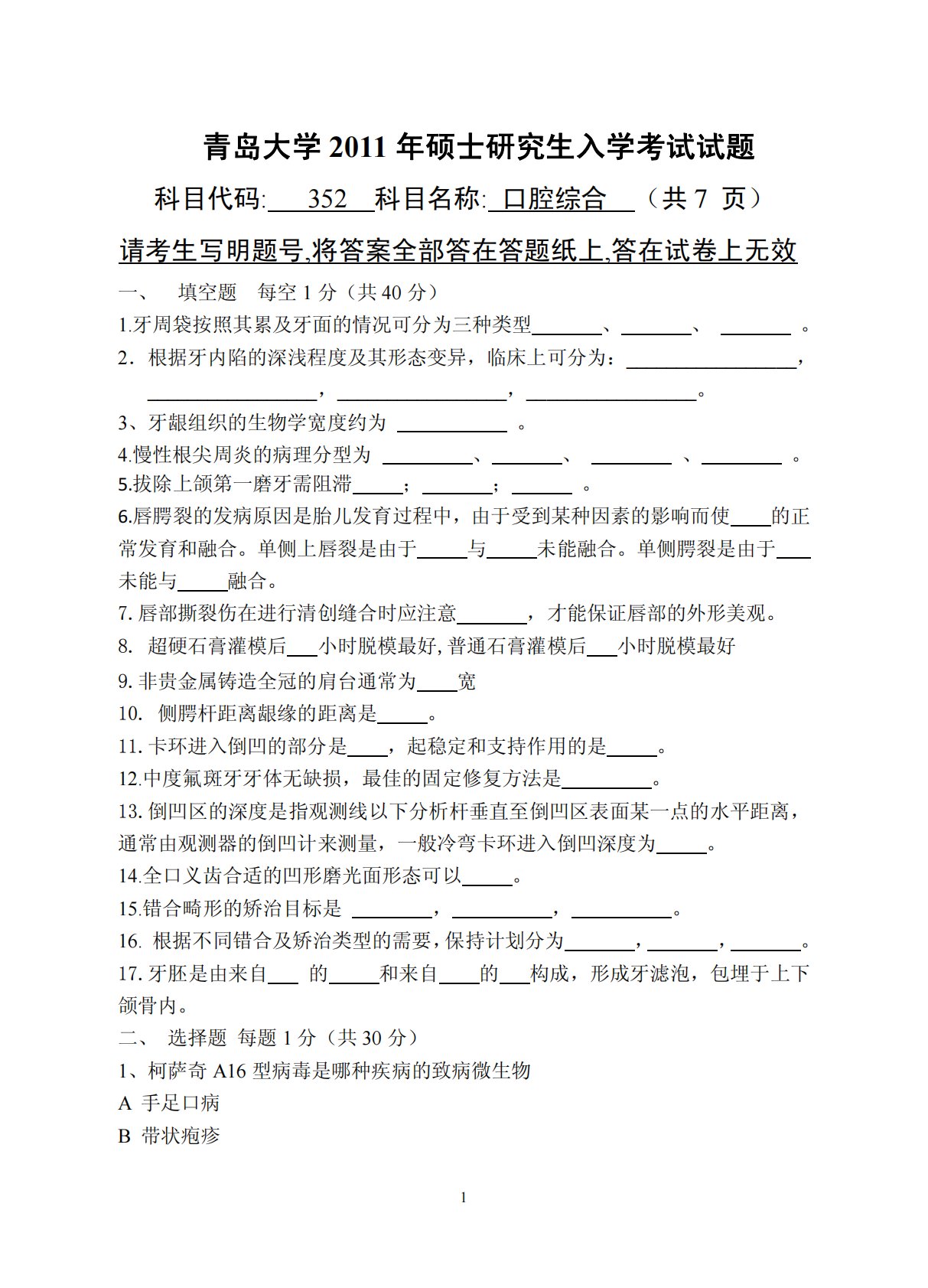 青岛大学2011年硕士研究生入学考试试题科目代码:352科目名称:口腔综合(共7页)请考生写明题号,将答案全部答在答题纸上,答在试卷上无效一、填空题每空1分(共40分)1.牙周袋按照其累及牙面的情况可分为三种类型、、。2.根据牙内陷的深浅程度及其形态变异,临床上可分为:_________________,_________________,_________________,_________________。3、牙龈组织的生物学宽度约为。4.慢性根尖周炎的病理分型为、、、。5.拔除上颌第一磨牙需阻滞 ; ; 。 6.唇腭裂的发病原因是胎儿发育过程中,由于受到某...