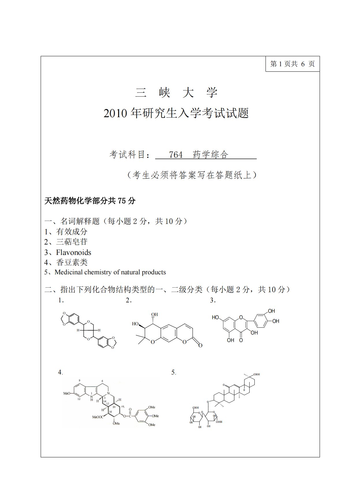 三峡大学349药学综合2010年真题