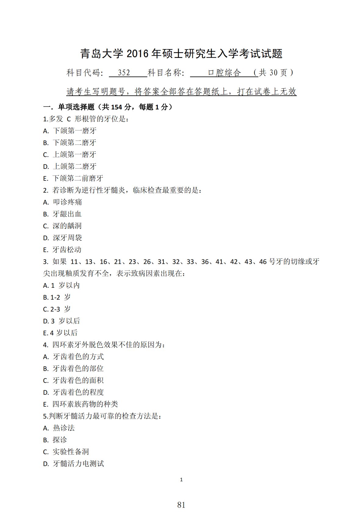 1青岛大学2016年硕士研究生入学考试试题科目代码:352科目名称:口腔综合(共30页)请考生写明题号,将答案全部答在答题纸上,打在试卷上无效一.单项选择题(共154分,每题1分)1.多发C形根管的牙位是:A.下颌第一磨牙B.下颌第二磨牙C.上颌第一磨牙D.上颌第二磨牙E.下颌第二前磨牙2.若诊断为逆行性牙髓炎,临床检查最重要的是:A.叩诊疼痛B.牙龈出血C.深的龋洞D.深牙周袋E.牙齿松动3.如果11、13、16、21、23、26、31、32、33、36、41、42、43、46号牙的切缘或牙尖出现釉质发育不全,表示致病因素出现在:A.1岁以内B.1-2岁C.2-3岁D.3岁以后E.4岁以后4...