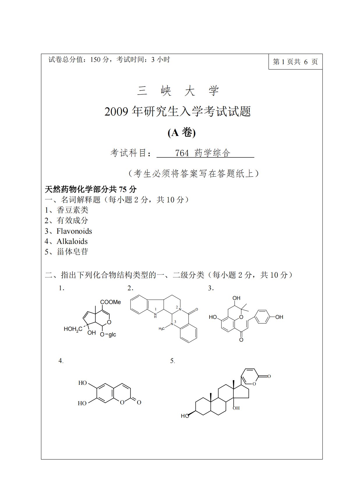 三峡大学349药学综合2009年真题