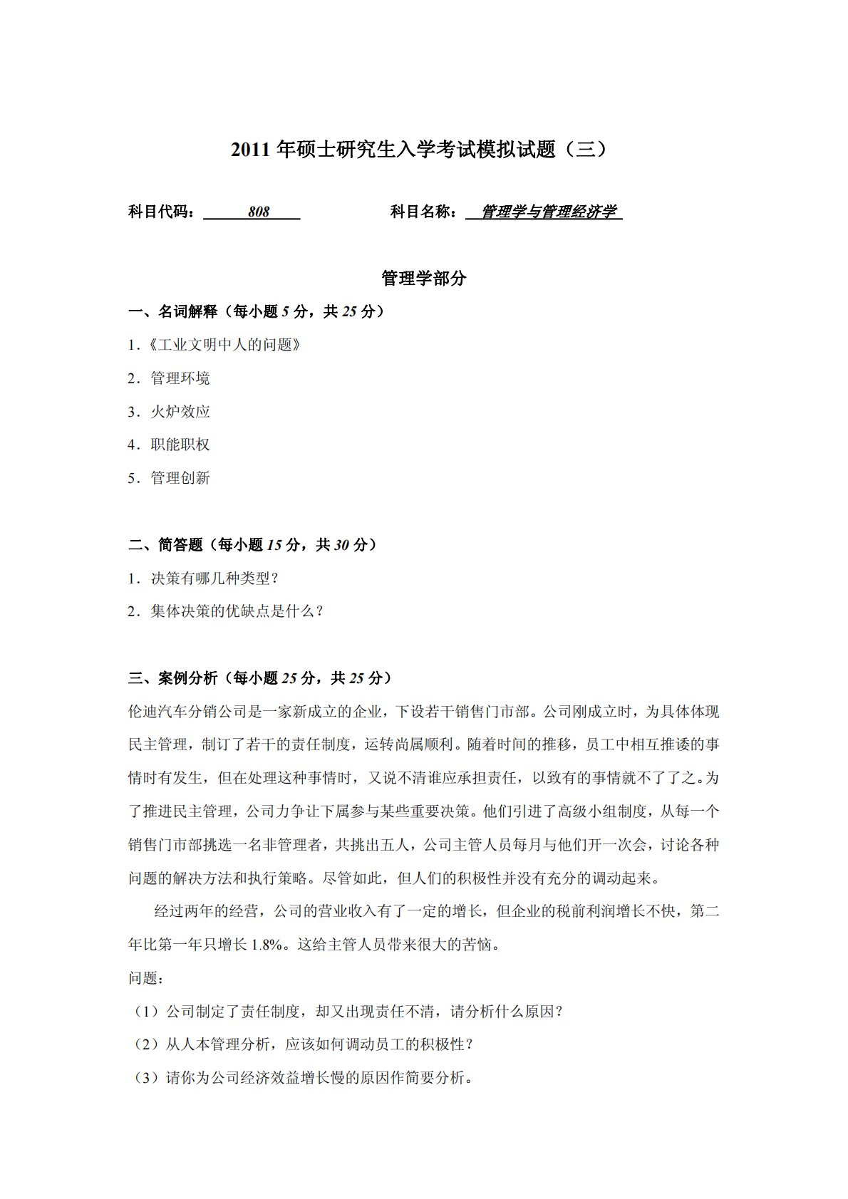 2011年硕士研究生入学考试模拟试题(三)科目代码:808科目名称:管理学与管理经济学管理学部分一、名词解释(每小题5分,共25分)1.《工业文明中人的问题》2.管理环境3.火炉效应4.职能职权5.管理创新二、简答题(每小题15分,共30分)1.决策有哪几种类型?2.集体决策的优缺点是什么?三、案例分析(每小题25分,共25分)伦迪汽车分销公司是一家新成立的企业,下设若干销售门市部。公司刚成立时,为具体体现民主管理,制订了若干的责任制度,运转尚属顺利。随着时间的推移,员工中相互推诿的事情时有发生,但在处理这种事情时,又说不清谁应承担责任,以致有的事情就不了了之。为了推进民主管理,公司力争让下属...