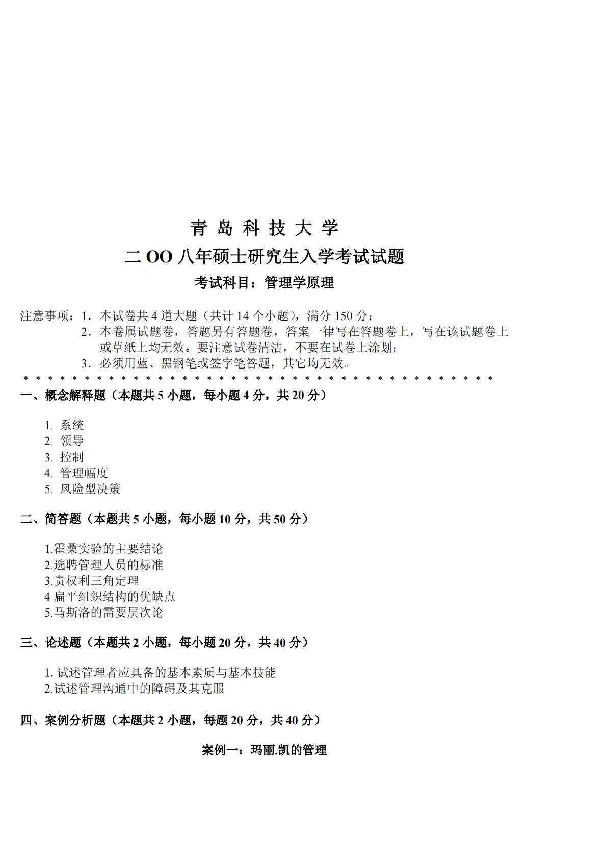 青岛科技大学二OO八年硕士研究生入学考试试题考试科目:管理学原理注意事项:1.本试卷共4道大题(共计14个小题),满分150分;2.本卷属试题卷,答题另有答题卷,答案一律写在答题卷上,写在该试题卷上或草纸上均无效。要注意试卷清洁,不要在试卷上涂划;3.必须用蓝、黑钢笔或签字笔答题,其它均无效。﹡﹡﹡﹡﹡﹡﹡﹡﹡﹡﹡﹡﹡﹡﹡﹡﹡﹡﹡﹡﹡﹡﹡﹡﹡﹡﹡﹡﹡﹡﹡﹡﹡﹡﹡﹡﹡﹡﹡一、概念解释题(本题共5小题,每小题4分,共20分)1.系统2.领导3.控制4.管理幅度5.风险型决策二、简答题(本题共5小题,每小题10分,共50分)1.霍桑实验的主要结论2.选聘管理人员的标准3.责权利三角定理4扁平组织结构...