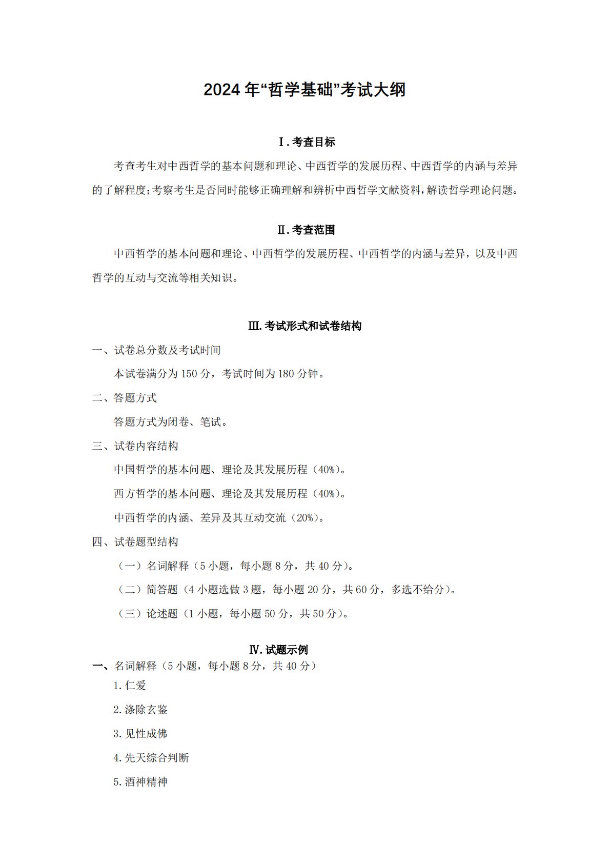 2024年“哲学基础”考试大纲Ⅰ.考查目标考查考生对中西哲学的基本问题和理论、中西哲学的发展历程、中西哲学的内涵与差异的了解程度;考察考生是否同时能够正确理解和辨析中西哲学文献资料,解读哲学理论问题。Ⅱ.考查范围中西哲学的基本问题和理论、中西哲学的发展历程、中西哲学的内涵与差异,以及中西哲学的互动与交流等相关知识。Ⅲ.考试形式和试卷结构一、试卷总分数及考试时间本试卷满分为150分,考试时间为180分钟。二、答题方式答题方式为闭卷、笔试。三、试卷内容结构中国哲学的基本问题、理论及其发展历程(40%)。西方哲学的基本问题、理论及其发展历程(40%)。中西哲学的内涵、差异及其互动交流(20%)。四、...
