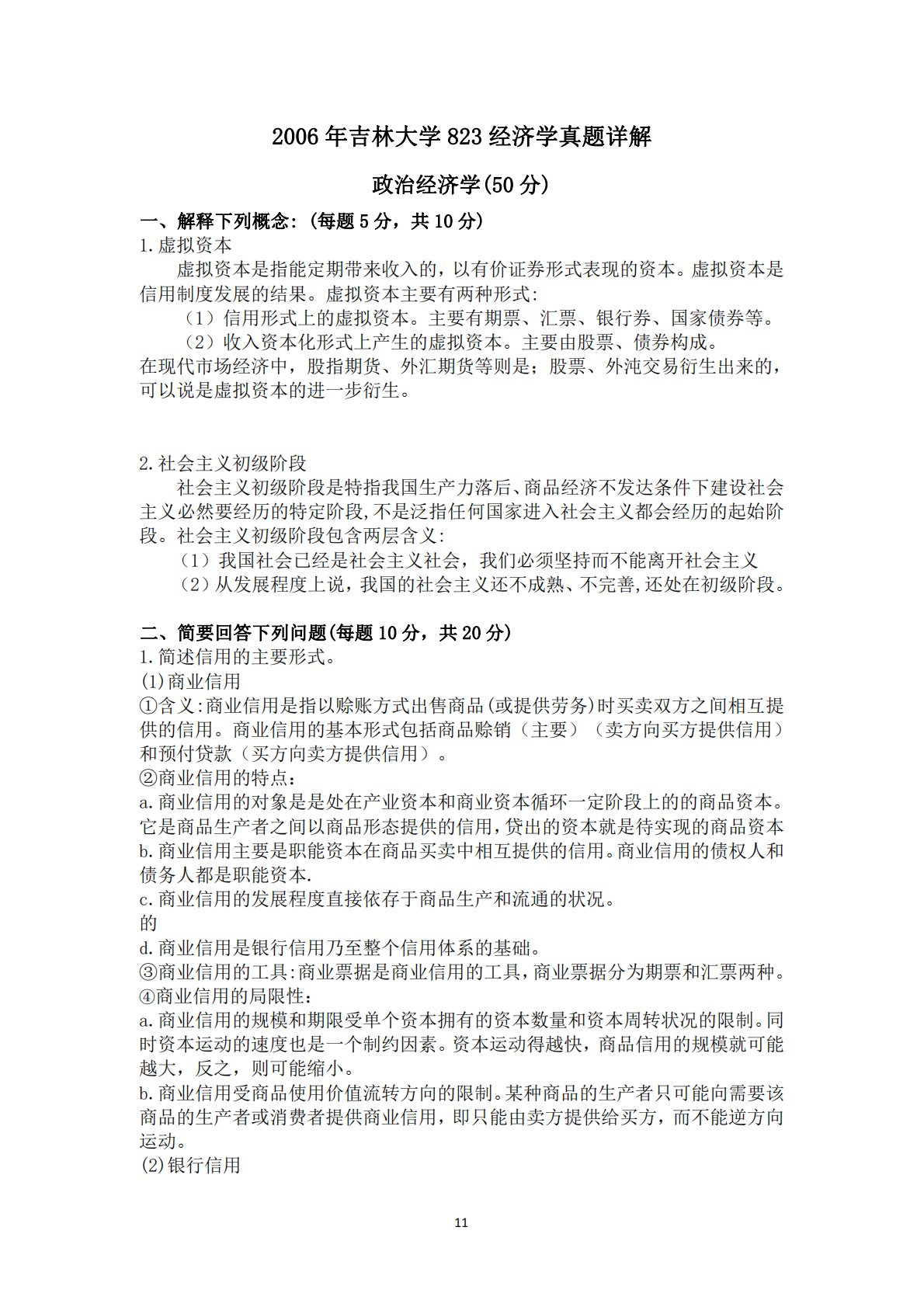112006年吉林大学823经济学真题详解政治经济学(50分)一、解释下列概念:(每题5分,共10分)1.虚拟资本虚拟资本是指能定期带来收入的,以有价证券形式表现的资本。虚拟资本是信用制度发展的结果。虚拟资本主要有两种形式:(1)信用形式上的虚拟资本。主要有期票、汇票、银行券、国家债券等。(2)收入资本化形式上产生的虚拟资本。主要由股票、债券构成。在现代市场经济中,股指期货、外汇期货等则是;股票、外沌交易衍生出来的,可以说是虚拟资本的进一步衍生。2.社会主义初级阶段社会主义初级阶段是特指我国生产力落后、商品经济不发达条件下建设社会主义必然要经历的特定阶段,不是泛指任何国家进入社会主义都会经历的...
