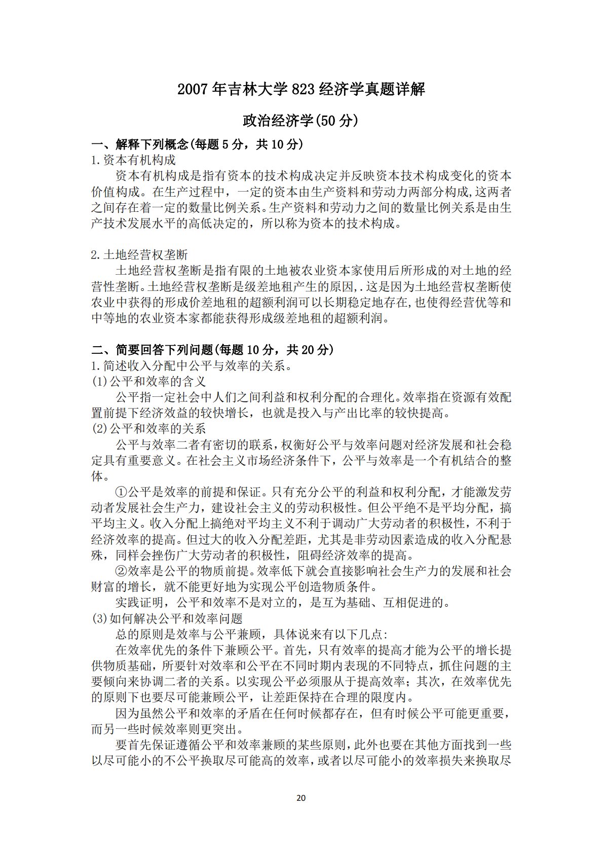 202007年吉林大学823经济学真题详解政治经济学(50分)一、解释下列概念(每题5分,共10分)1.资本有机构成资本有机构成是指有资本的技术构成决定并反映资本技术构成变化的资本价值构成。在生产过程中,一定的资本由生产资料和劳动力两部分构成,这两者之间存在着一定的数量比例关系。生产资料和劳动力之间的数量比例关系是由生产技术发展水平的高低决定的,所以称为资本的技术构成。2.土地经营权垄断土地经营权垄断是指有限的土地被农业资本家使用后所形成的对土地的经营性垄断。土地经营权垄断是级差地租产生的原因,.这是因为土地经营权垄断使农业中获得的形成价差地租的超额利润可以长期稳定地存在,也使得经营优等和中等...