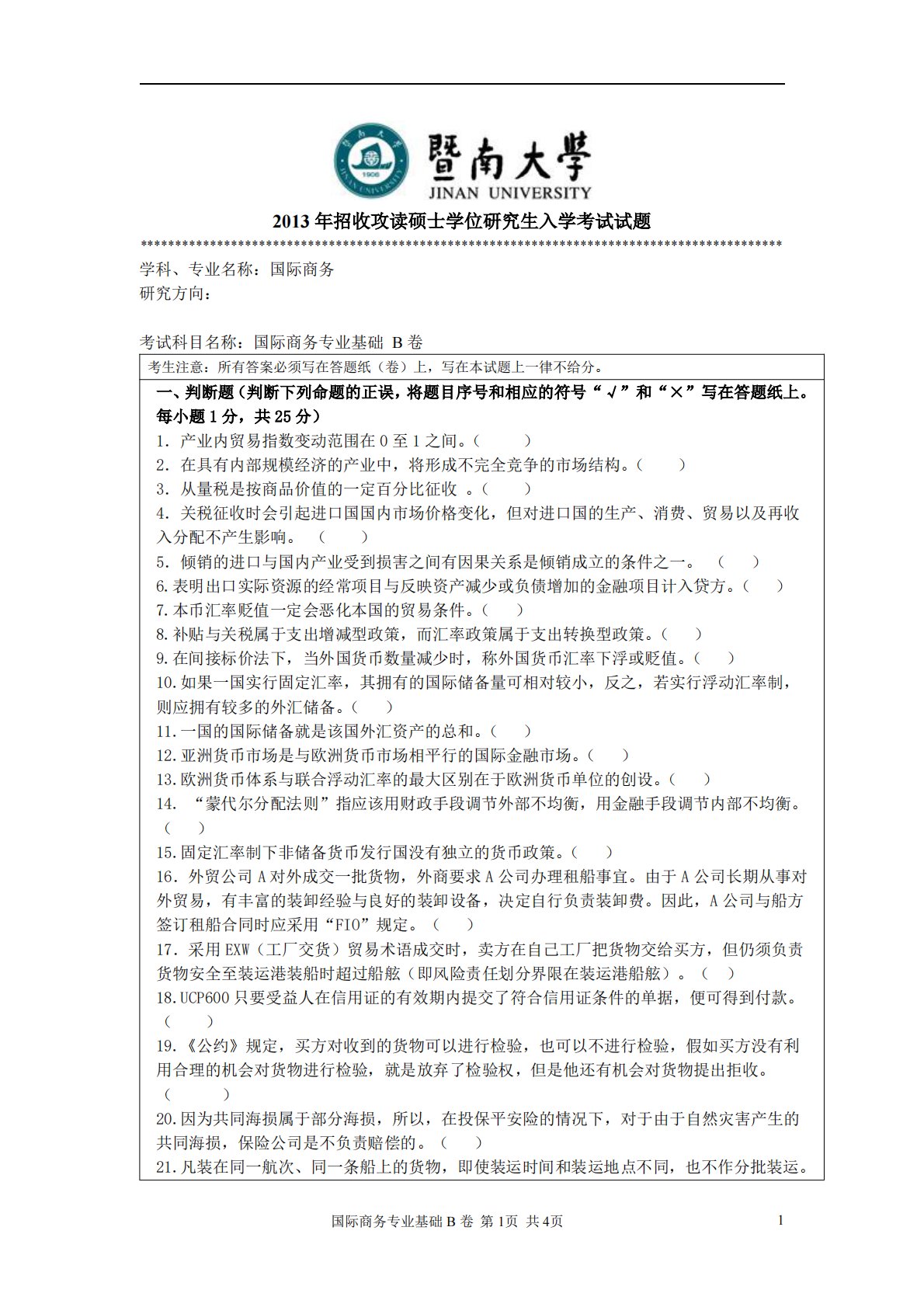 国际商务专业基础B卷第1页共4页12013年招收攻读硕士学位研究生入学考试试题********************************************************************************************学科、专业名称:国际商务研究方向:考试科目名称:国际商务专业基础B卷考生注意:所有答案必须写在答题纸(卷)上,写在本试题上一律不给分。一、判断题(判断下列命题的正误,将题目序号和相应的符号“√”和“×”写在答题纸上。每小题1分,共25分)1.产业内贸易指数变动范围在0至1之间。()2.在具有内部规模经济的产业中,将形成不完全竞争的市场结...