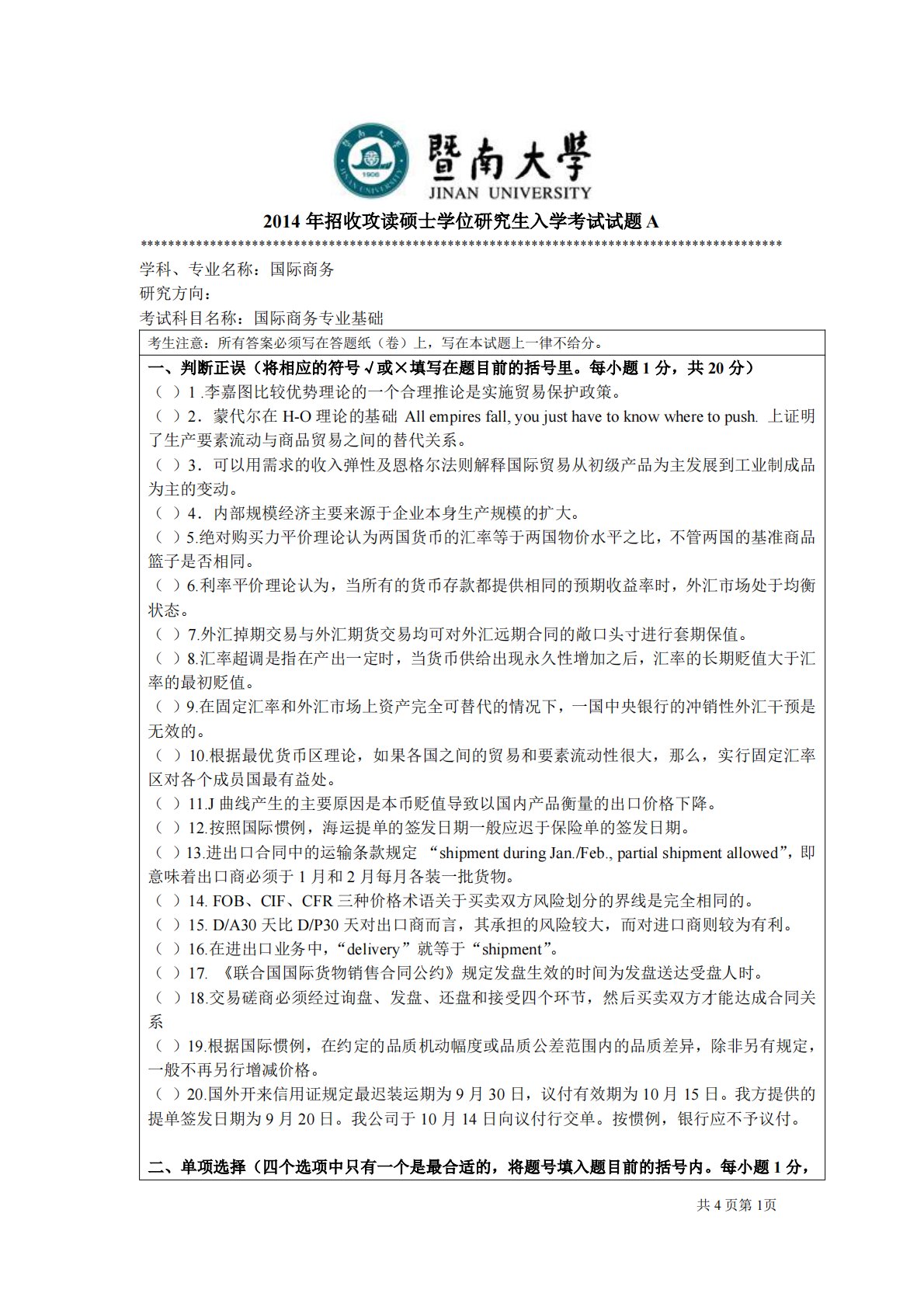 暨南大学434国际商务专业基础2014年真题